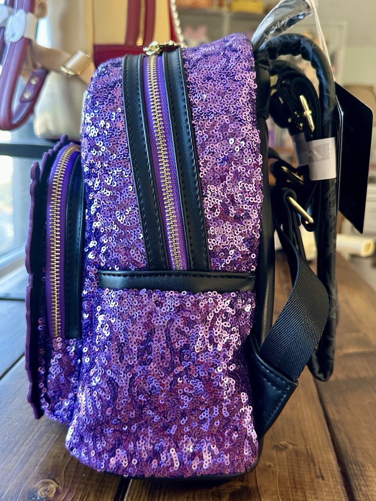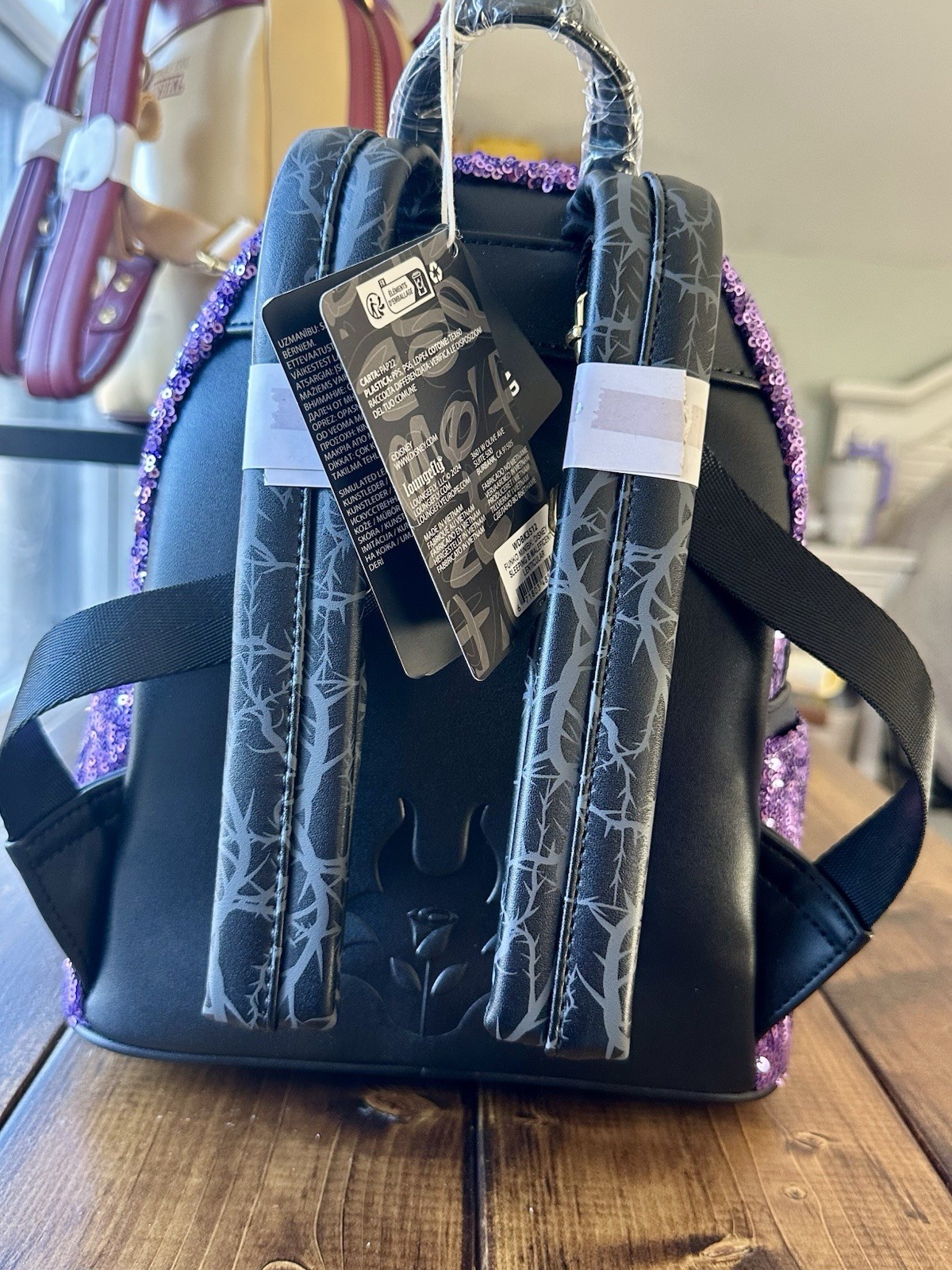 NWT in original packaging! UK exclusive release! Introducing the Magical Mayhem Collection! Maleficent is back with another loungefly design that pays homage to Maleficent's alter ego! Some say she is evil, we say she's magical! On the front, a lenticular design shows Maleficent in both her human and dragon form surrounded by the twisted thorns that surround her castle. For extra sparkle that Maleficent deserves, this mini backpack is adorned in textured sequins in Maleficent's trademark purple. Turn the bag around and you will find the instantly recognisable image of the outline of Maleficent, a rose sits in the centre as a reference to the Briar Rose/Aurora. The enamel zipper charm is her ever loyal pet Diablo. Its gets better! Look inside and you will find an all over print of Maleficent and her Dragon form, surrounded by thorns. This backpack is an officially licensed Disney product. Bag Dimensions: Approx W9" x H10.5" x D4.5"