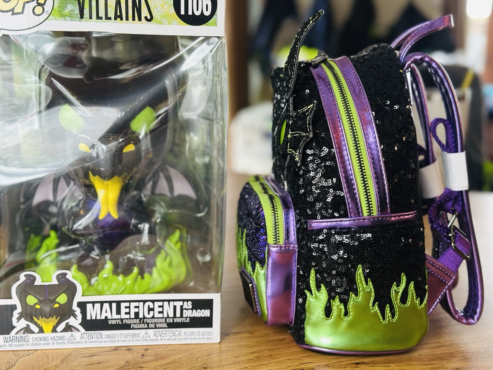 NWT bundle featuring a sealed in package Maleficent dragon Jumbo Pop and Light up sequin Loungefly Sparkly sequins cover this Loungefly Disney Villains Maleficent Dragon Sequin Light Up & Glow Mini Backpack, and Maleficent’s face glows and lights up for an added dose of drama. This officially licensed Disney backpack measures approximately 9” W x 10.5” H x 4.5” D.