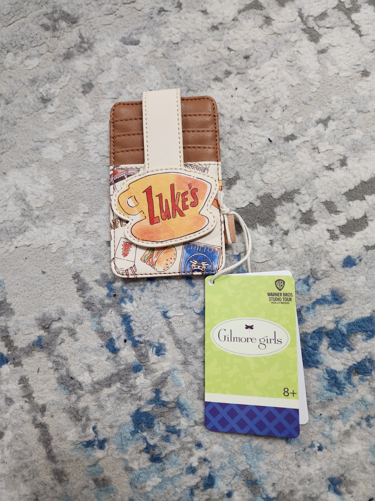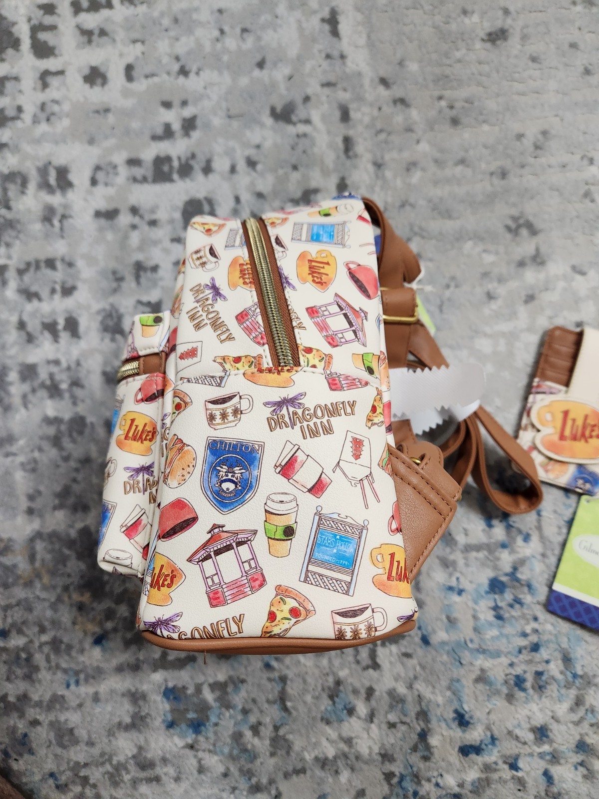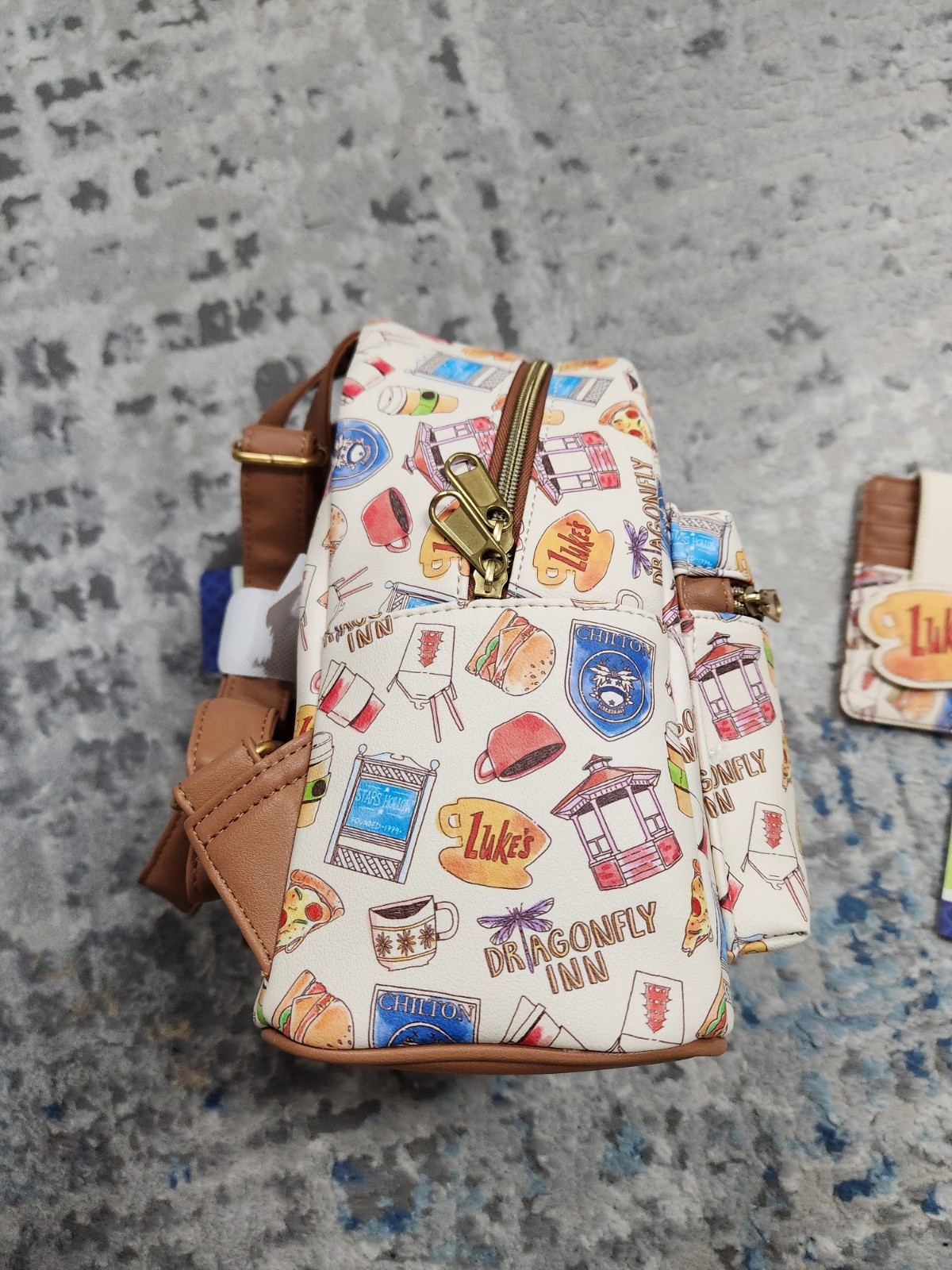 Cardholder: It's Gilmore Girls rewatch season! This cardholder features an allover print of symbols from the show, like the Chilton school seal, the Dragonfly Inn sign, the gazebo, and a Luke's coffee shop sign that snaps over the card and cash slots. The cardholder also has a clear ID display. 3" x 5" Polyurethane Backpack: Pack all of your essentials for la-la-la season in this Gilmore Girls mini backpack! Featuring an allover print of icons from the show like, Luke's Diner, the gazebo, coffee cups, the Chilton logo and more! Comes with adjustable straps and interior drop pocket. 9'' x 4 1/2'' x 10 1/2'' Polyurethane Adjustable straps Interior drop pocket