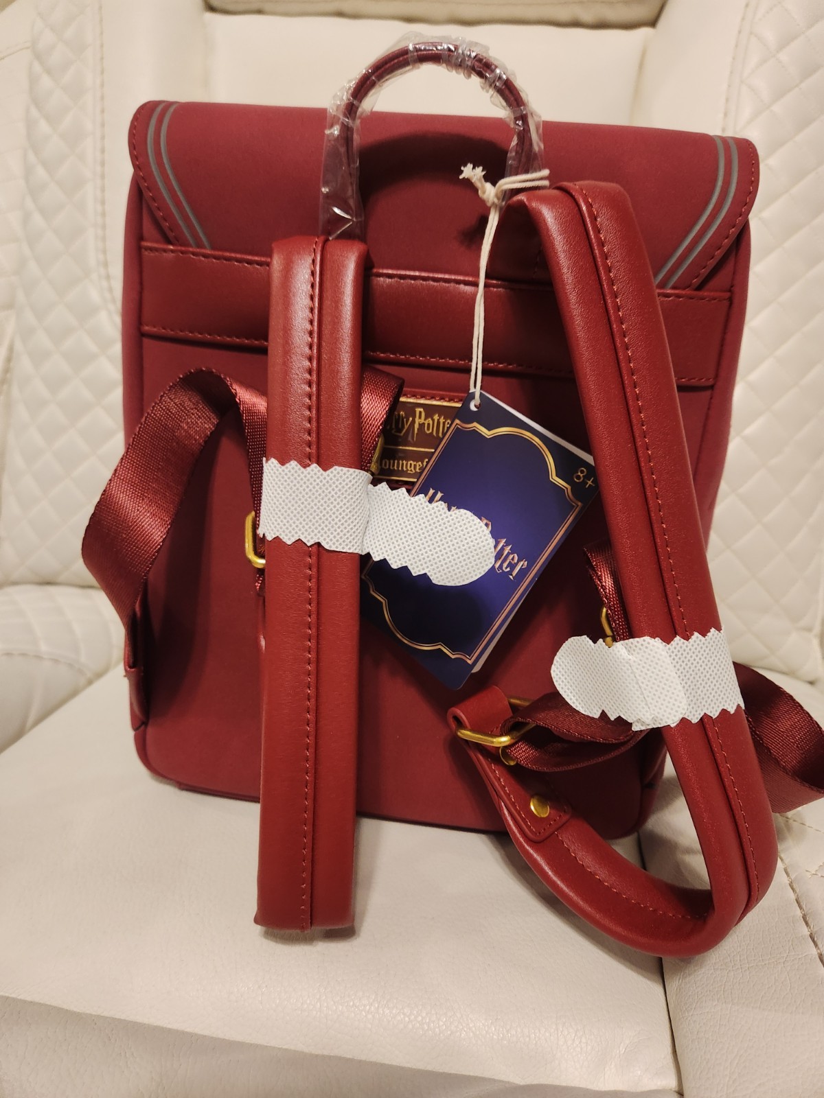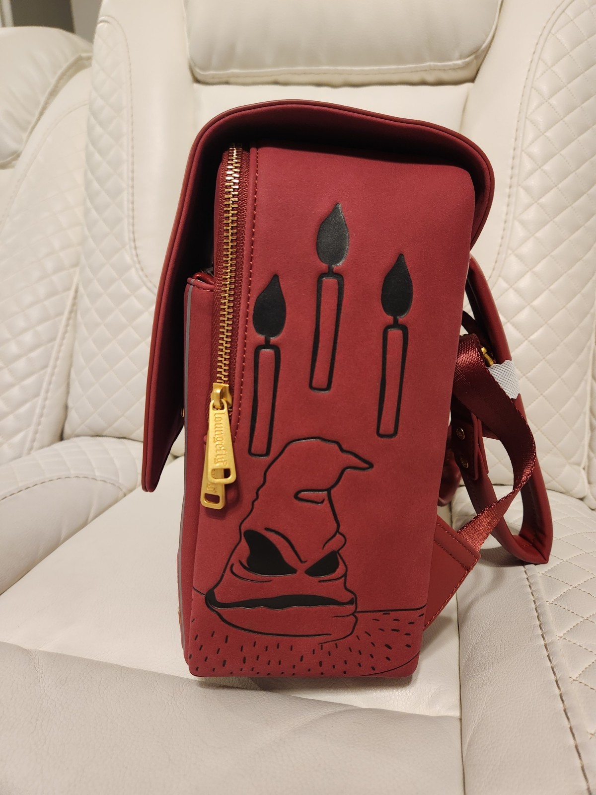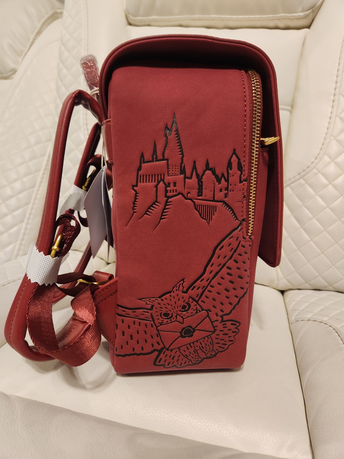 Backpack: Accio cutest mini backpack around! This Harry Potter bag features Harry's glasses and iconic scar above his name, accented with embroidered and debossed details. Hogwarts icons adorn the bag's bottom, while owls and the castle are fitted to the sides. With a front pouch and middle compartment, there's plenty of room for your valuables. Polyurethane Approx. 10 1/2" H x 8 1/2" W x 5 1/2" D