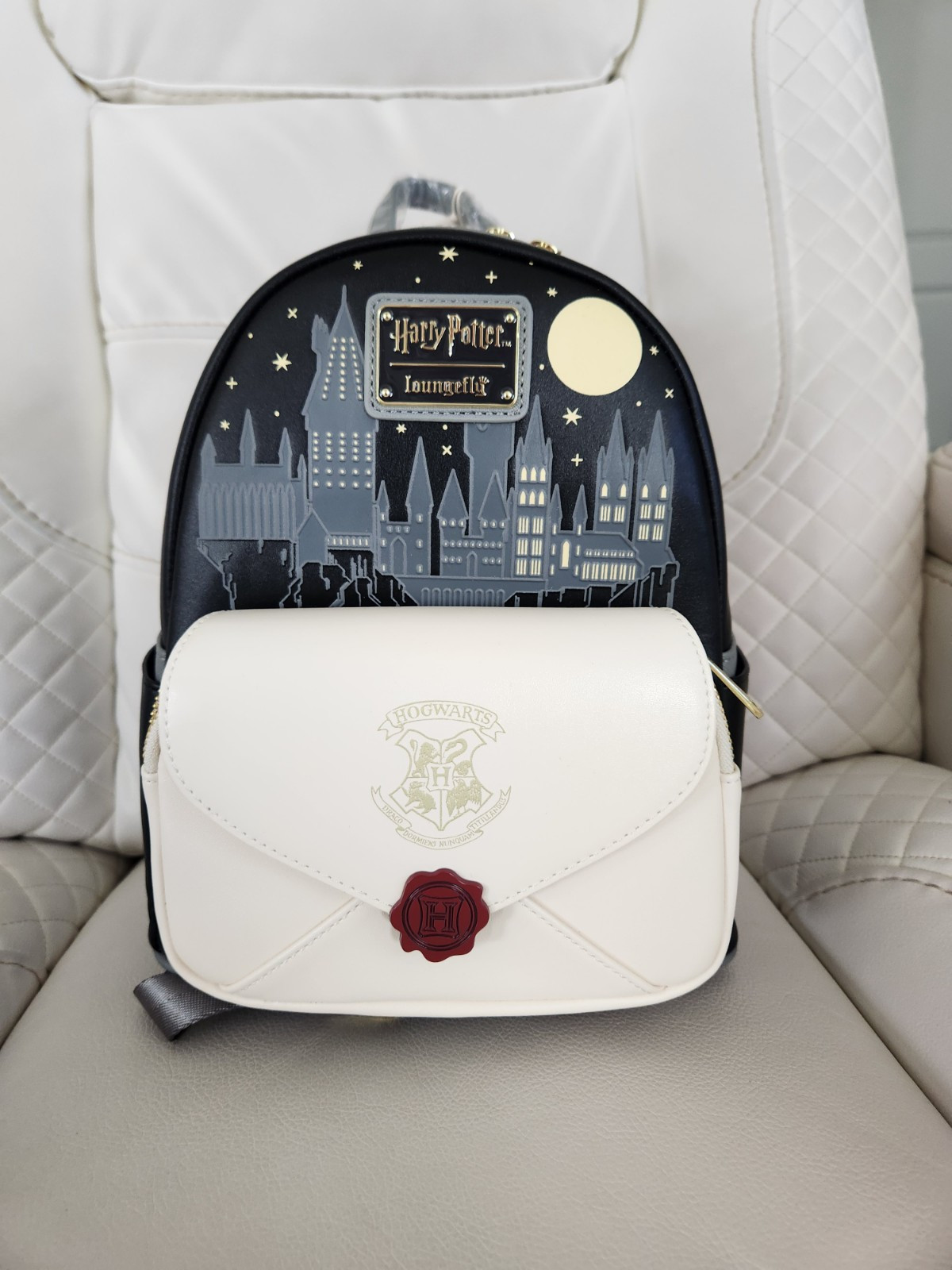 Wallet: If you didn't already get your letter, there's still time to get this letter-inspired wallet! This Harry Potter accessory is fashioned into an envelope fitted with an enamel crest, while inside sits four card slots and a clear ID sleeve. Polyurethane Approx. 4 1/2" H x 5" W Backpack: If you didn't already get your letter, there's still time to get this letter-inspired mini backpack! This Harry Potter bag features a front pocket fashioned into an envelope fitted with an enamel crest, backed by a debossed scene of Hogwarts under the full moon. Polyurethane Approx. 10 1/2" H x 8" W x 6" D