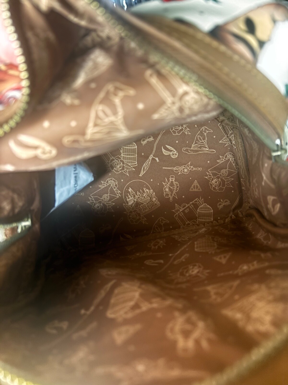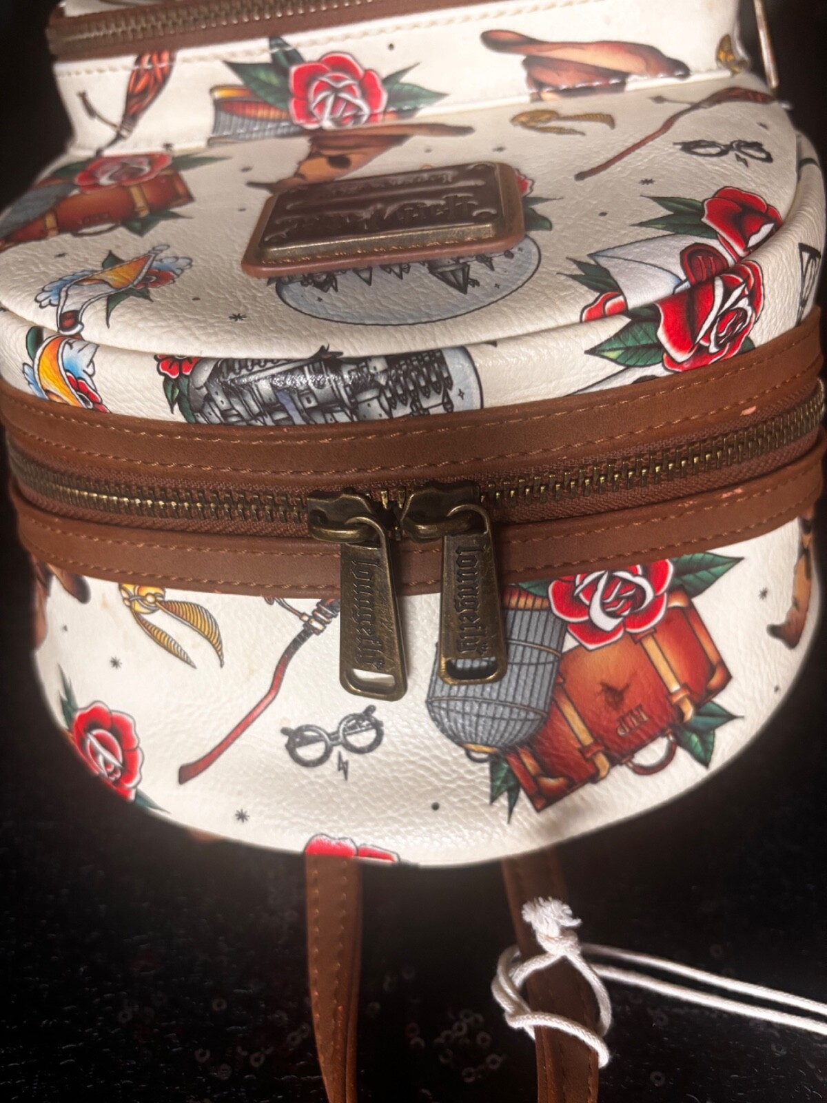 Explore the wizarding world with the Loungefly Harry Potter Tattoo Art Mini Backpack, an enchanting accessory for any fan. Crafted with an eye for detail, this backpack features a vivid tattoo-inspired design that celebrates the iconic characters and artistry from the beloved Harry Potter series. The supple leather lining adds a touch of luxury to this casual piece, ensuring that your essentials are carried in style.Designed with practicality in mind, this mini backpack is equipped with an adjustable shoulder strap for comfortable wear and a secure zip closure to keep your belongings safe. The shoulder strap and zipper accents provide both function and fashion, making it an ideal choice for everyday use or your next adventure.