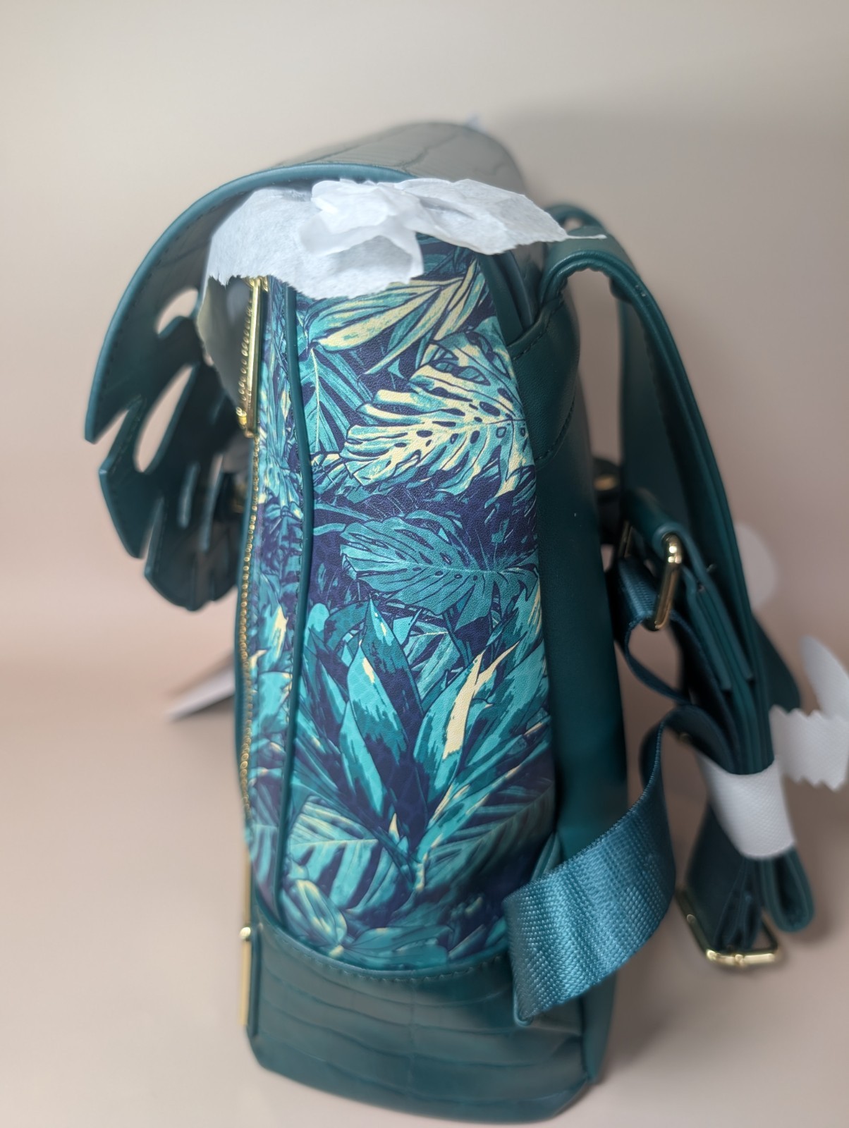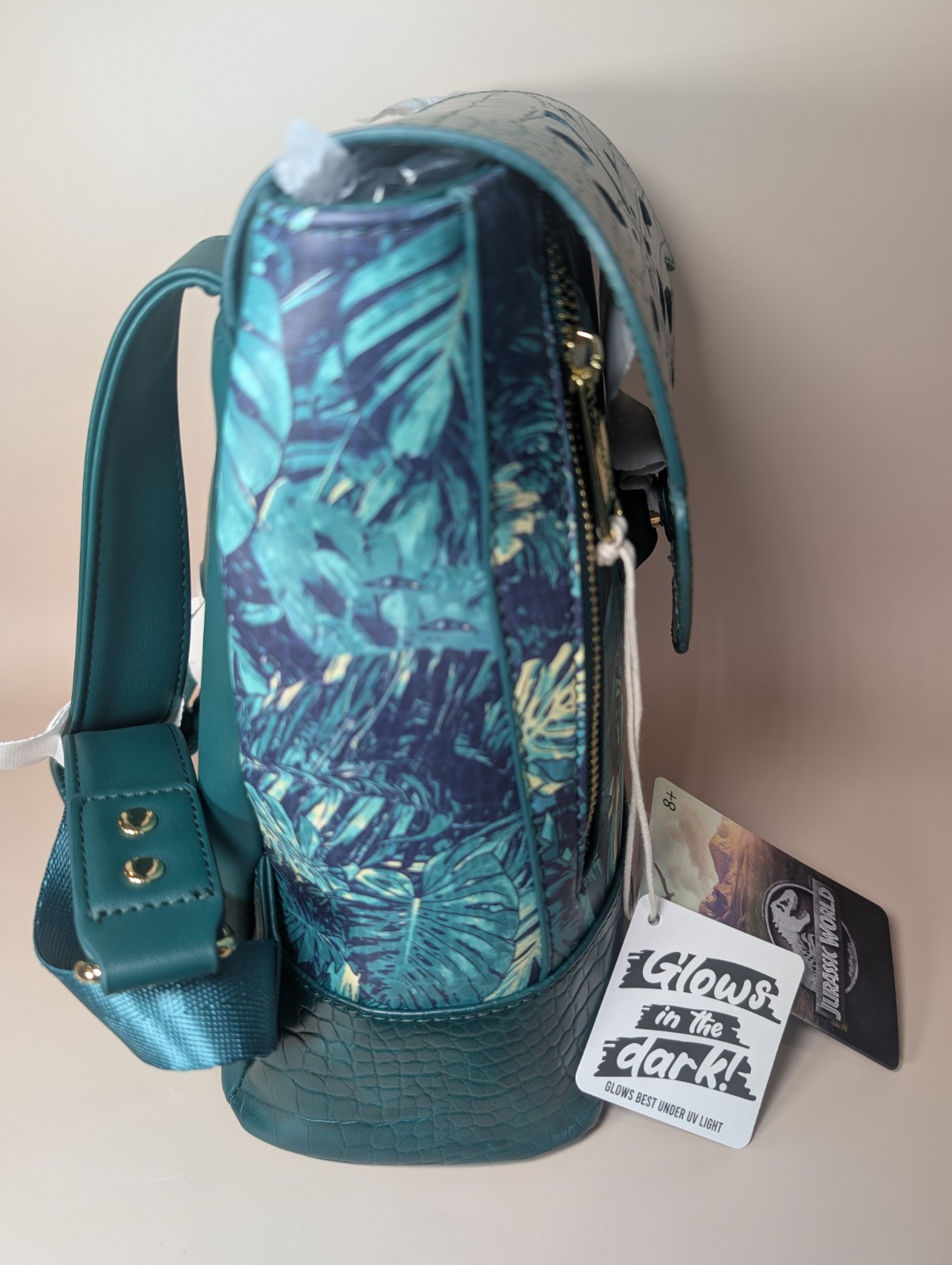 Brand new with tags! Jurassic World Jungle Glow-in-the-Dark Mini-Backpack: Journey through the jungle with the Jurassic World Jungle Glow-in-the-Dark Mini-Backpack! You can blend right in with this leafy jungle themed print. But watch out for the Velociraptor who has it's eye locked on its next thrilling mission, you! The eye glows-in-the dark and peeks through the leaf closure. This is a faux leather mini-backpack that features textured and crocodile faux leather details, adjustable shoulder straps, 2 zipper openings, an applique, and printed details with a coordinating interior lining! This mini-backpack measures approximately 9-inches wide x 10-inches tall x 4 1/2-inches deep. From a smoke-free, pet friendly home. All my bags are stored in a temperature controlled room. I ship quickly and package your item with care. The bag ships in a silk storage bag. Have questions please ask! I respond quickly! Thank you! :-) Have a great day!