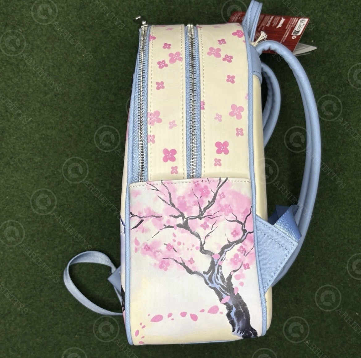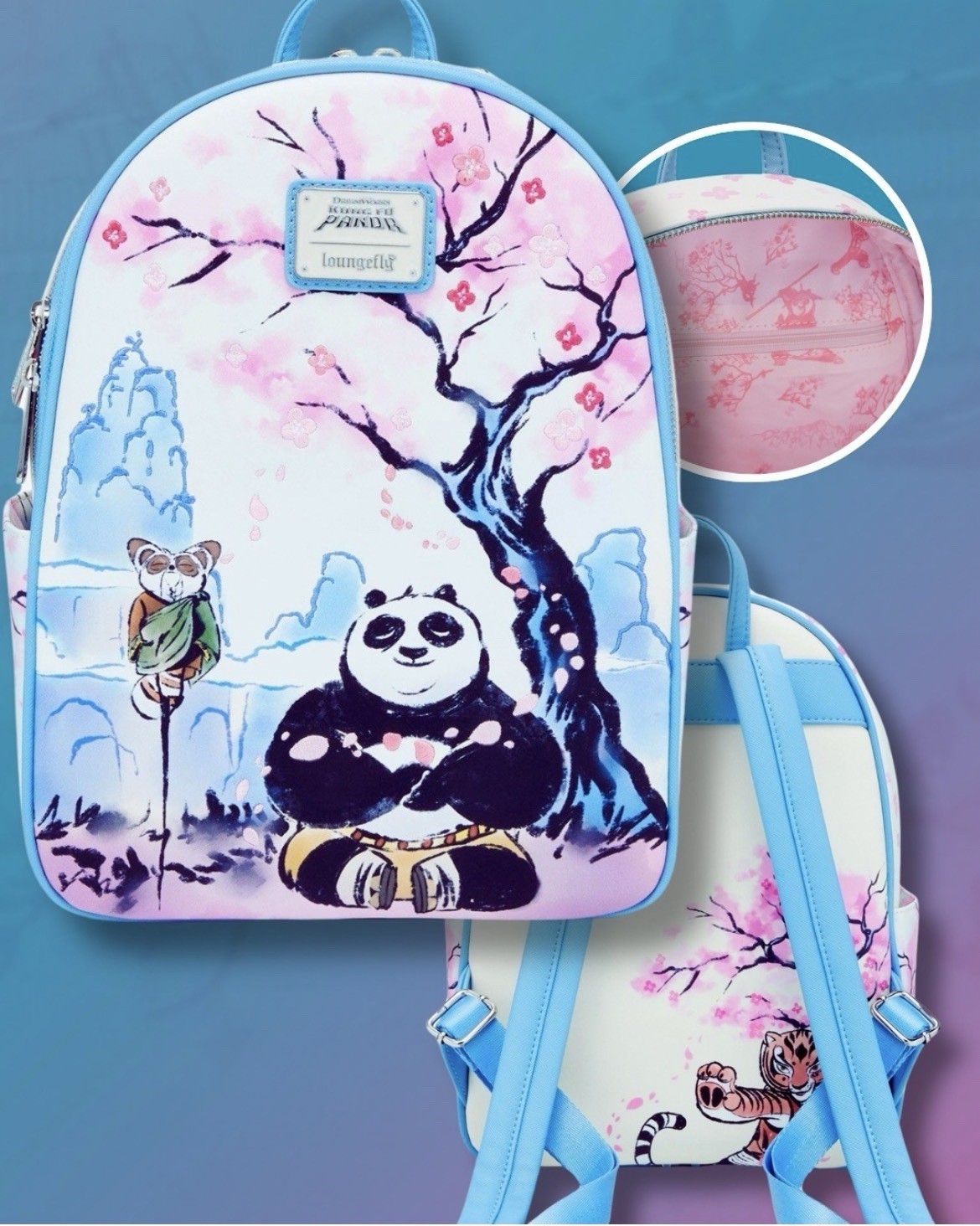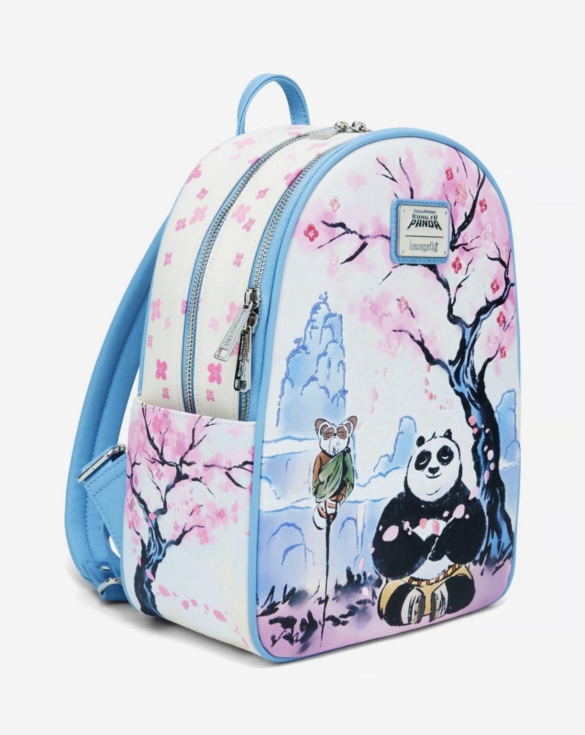 The Loungefly Kung Fu Panda Po Master Shifu Embroidered Cherry Blossom Mini Backpack is a stylish and small backpack perfect for women who are fans of the Kung Fu Panda movie. The pink exterior with embroidered floral accents and silver hardware gives it a chic and unique look. With adjustable shoulder straps and a zip closure, this backpack is both fashionable and practical for casual outings or parties. The faux leather and polyurethane materials ensure durability, while the stainless steel hardware adds a touch of quality to the overall design.