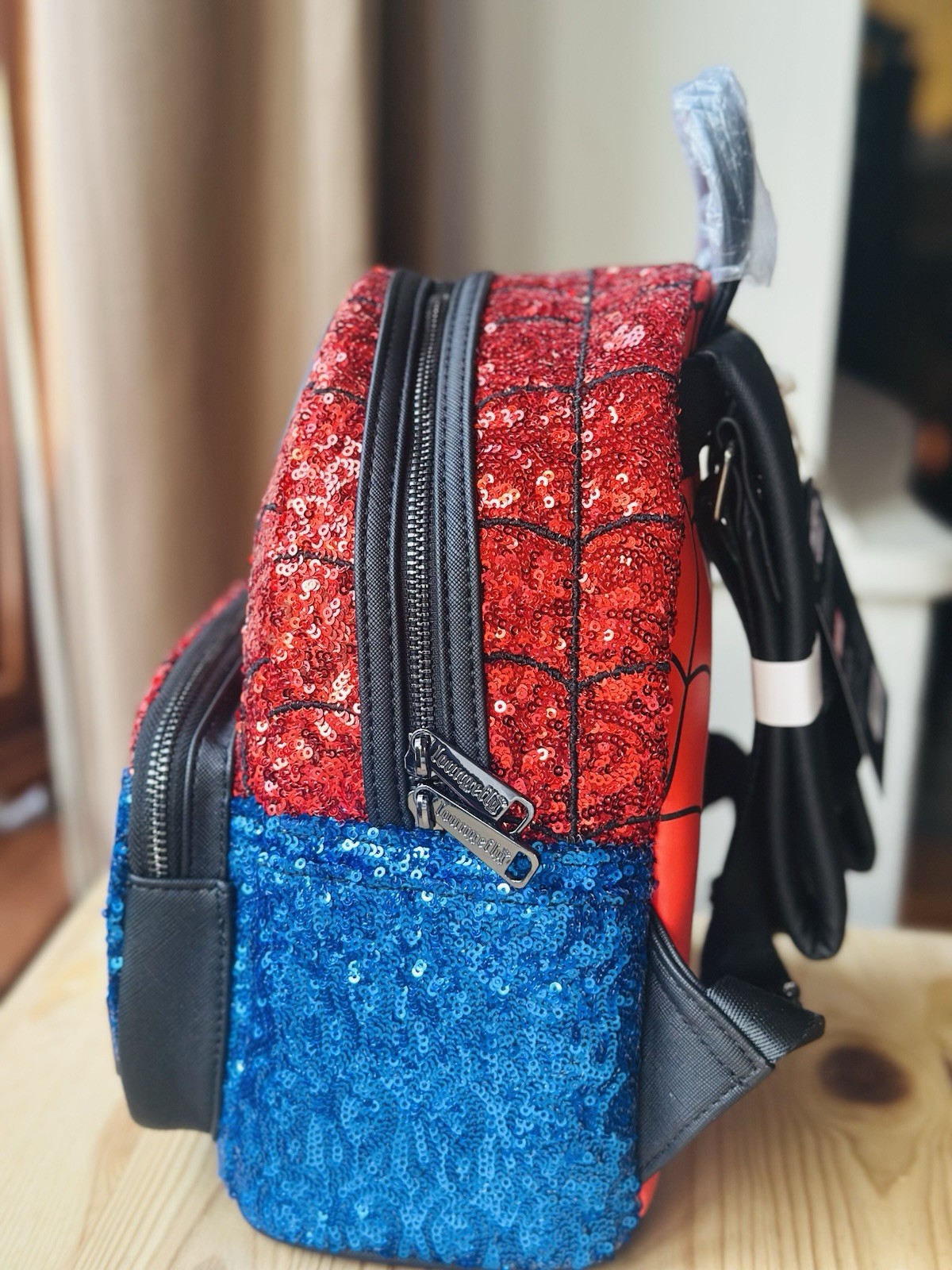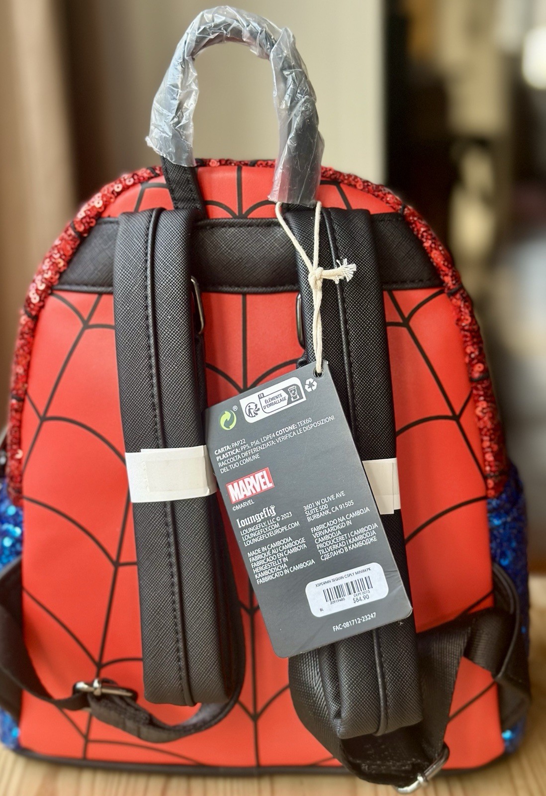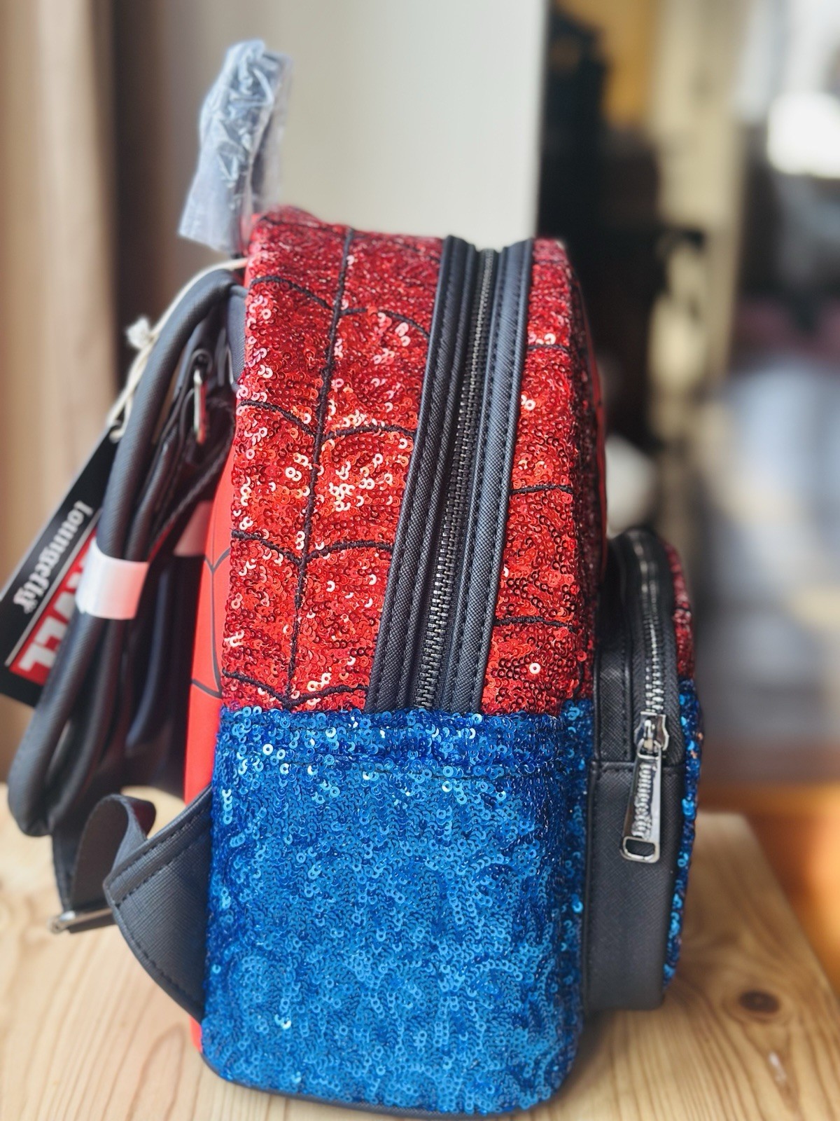 Loungefly Marvel Spider-Man Sequin Figural Mini Backpack - sold out BoxLunch Exclusive Add some sparkle to your web-slinging with this Spider-Man-inspired mini backpack! Featuring a sequined body and a Spider-Man logo applique on the front, this bag includes a front pocket, top handle, and adjustable straps, perfect for bringing on your next trip to the Disney Parks and beyond. A BoxLunch Exclusive! Polyurethane; polyester Approx. 9" W x 10" H x 4 1/2" D Imported