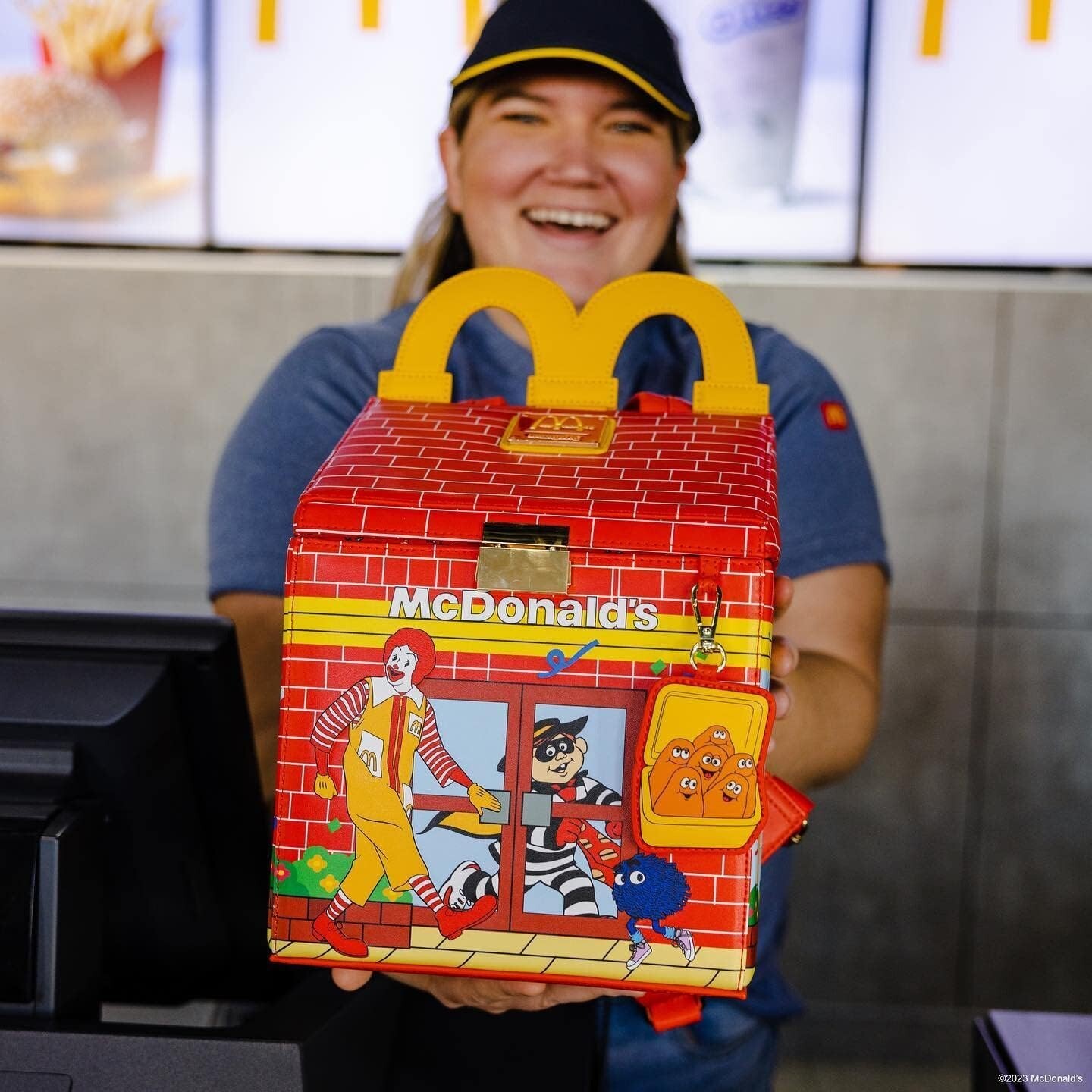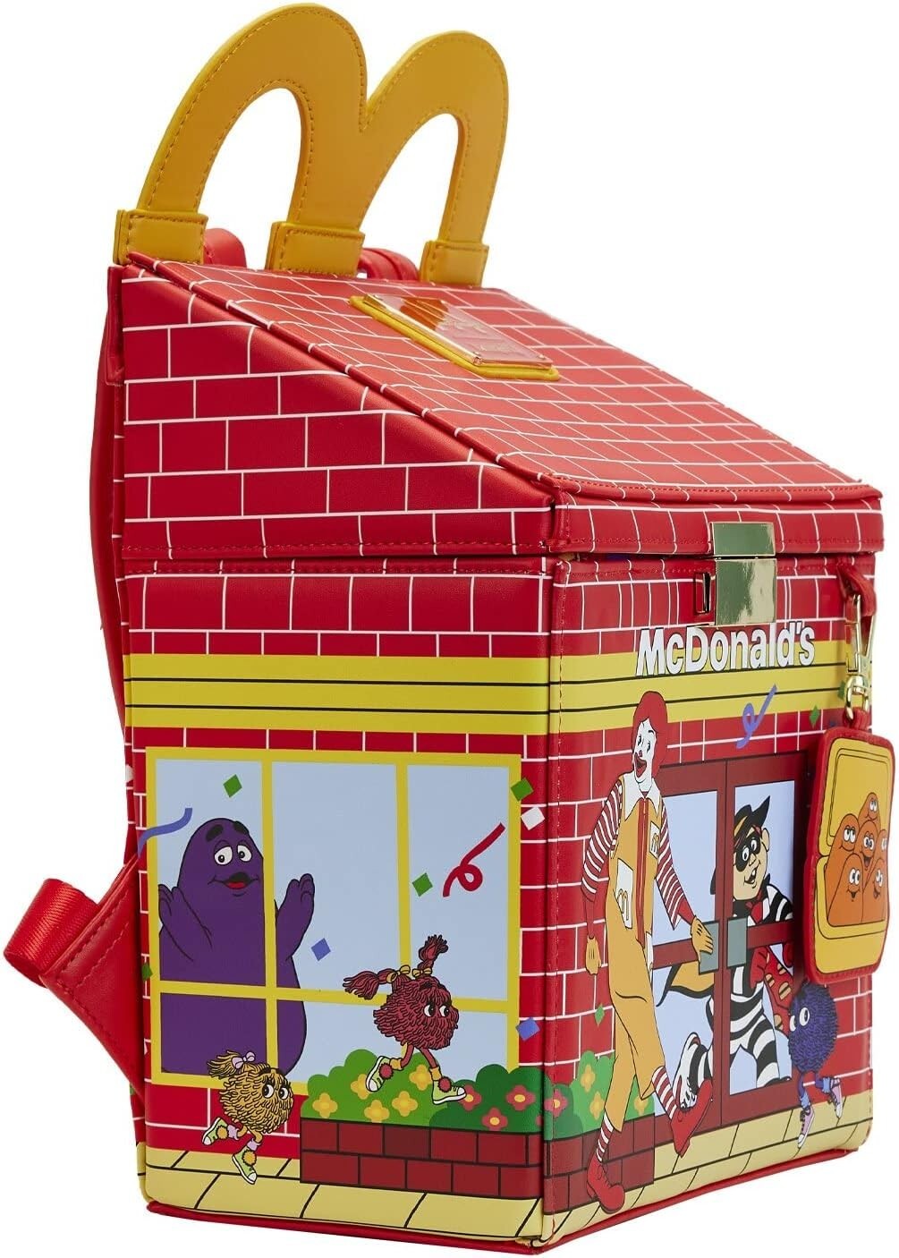 Step out in style with the Loungefly McDonald's Happy Meal Crossbody Bag, a delightful nod to nostalgia with a modern twist. Crafted from durable polyurethane, this small-sized backpack boasts a vibrant multicolor exterior with a matching lining, ensuring your essentials are cradled in comfort. The iconic Happy Meal character accents add a playful touch to this unisex accessory, making it a versatile addition to any collection.Functional and fashionable, this bag features a secure button closure, an adjustable red crossbody strap for customizable comfort, and gold-tone hardware that adds a touch of elegance. The stitching details reinforce the bag's stylish appeal while ensuring its longevity. Whether you're running errands or embarking on a casual adventure, this Loungefly exclusive is sure to turn heads and spark conversations. ITEM IS SOLD OUT AND LIKE NEW!