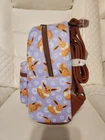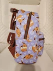 This is the exact pattern placement you will receive if purchased. Features Vegan leather (polyurethane) Adjustable shoulder straps Zippered main compartment Zippered front compartment Antique gold-colored metal hardware Printed details Product Description Bring your favorite Pokemon with you on all your adventures! This purple and brown mini backpack features Eevee posing on the front zipper pocket among flowers. Complete with top carrying handle, adjustable straps, interior drop pocket and top zipper closure.