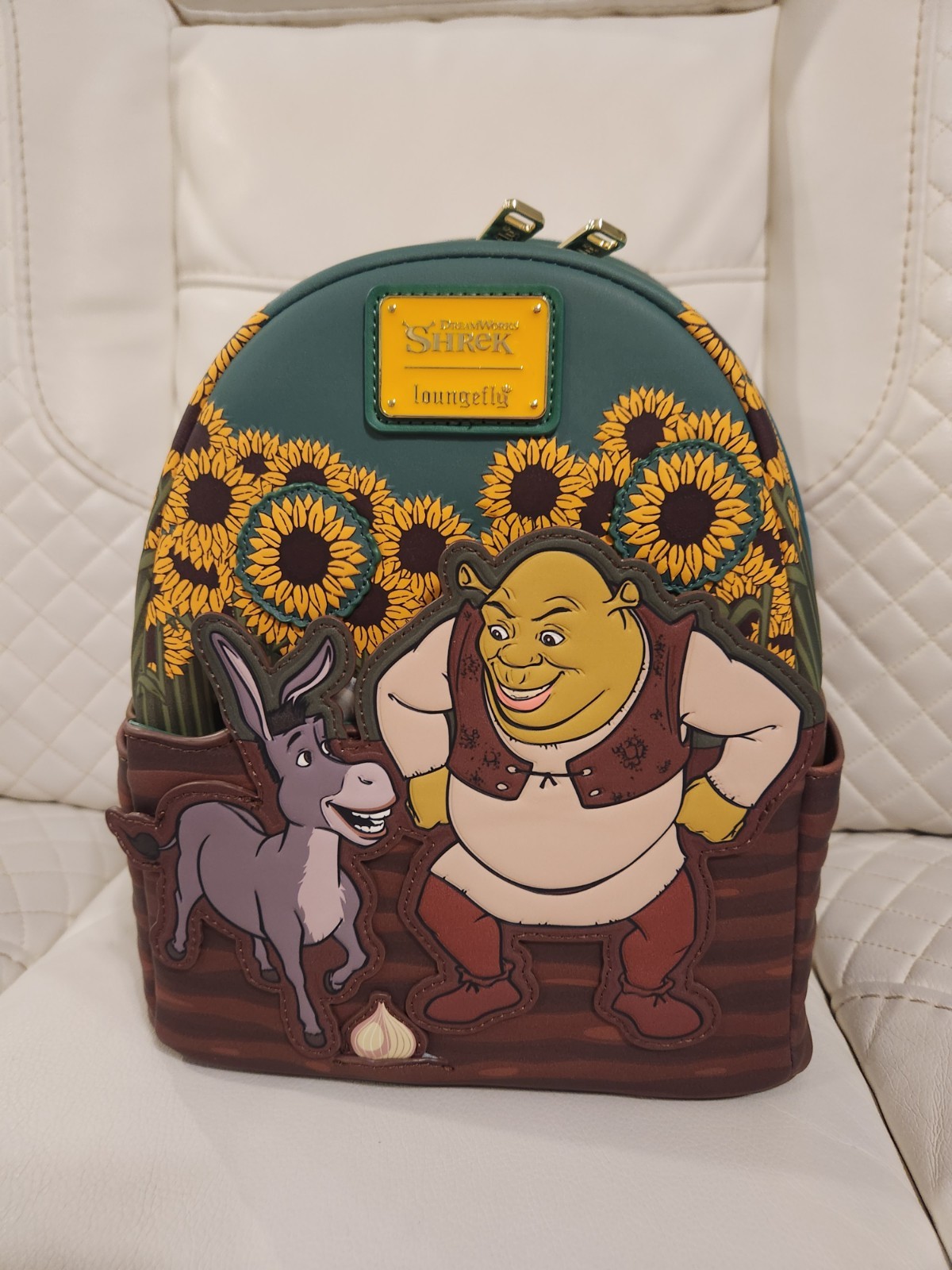 Wallet: Add some layers to your accessory collection with this Shrek wallet! Featuring an applique of Donkey and Shrek among sunflowers on the front, the back includes debossed "Ogres Have Layers!" lettering. With four card slots, a zippered coin pouch, and a clear ID sleeve in the interior, this wallet is perfect for your next quest. Polyurethane Approx. 4" H x 6" W Backpack: Add some layers to your accessory collection with this Shrek mini backpack! Featuring an applique of Donkey and Shrek among sunflowers on the front, the back includes printed "Ogres Have Layers!" lettering. With debossed details on the pockets and an onion zipper pull, this bag is perfect for your next quest. Polyurethane Approx. 11" H x 7 3/4" W x 5" D