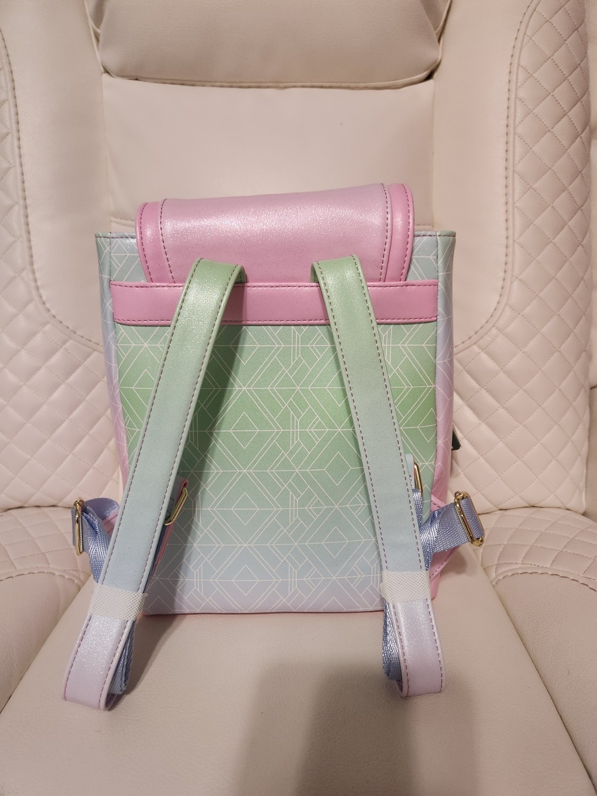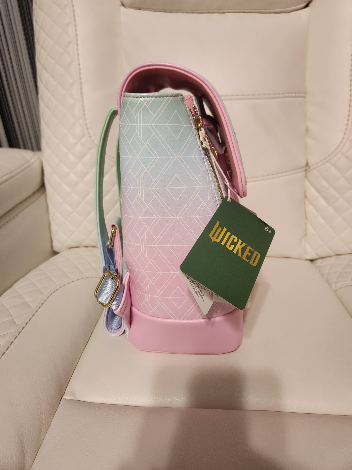 Travel to the Emerald City with this Wicked mini backpack! Made with an iridescent material, this bag is decorated with gold foil film icons and includes a drawstring closure. Polyurethane Approx. 9 1/2" W x 10 1/2" H x 5 1/2" D