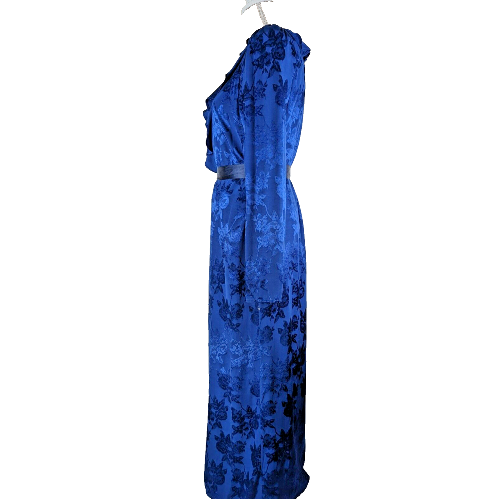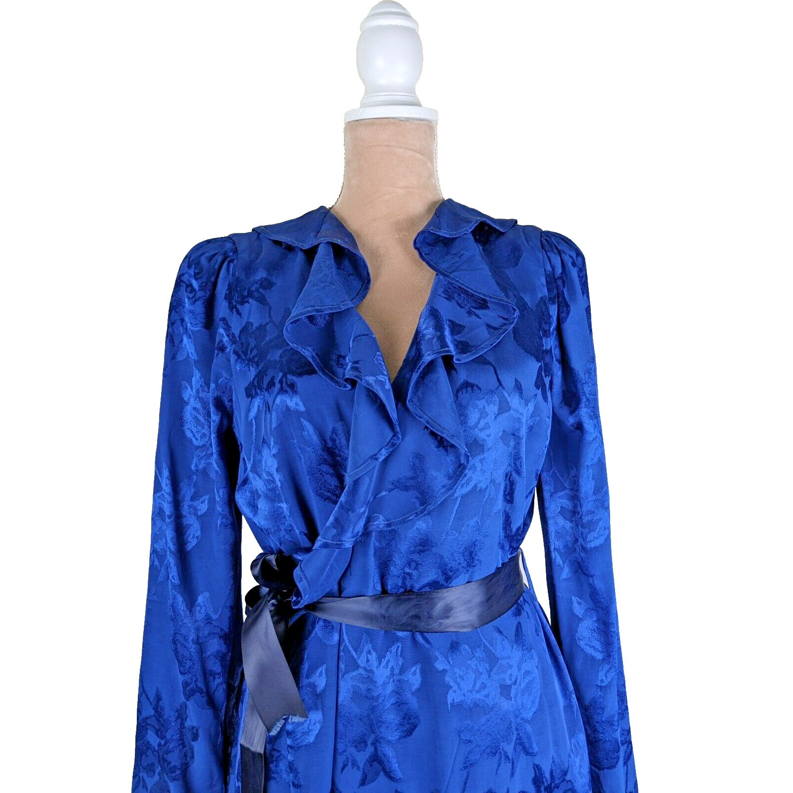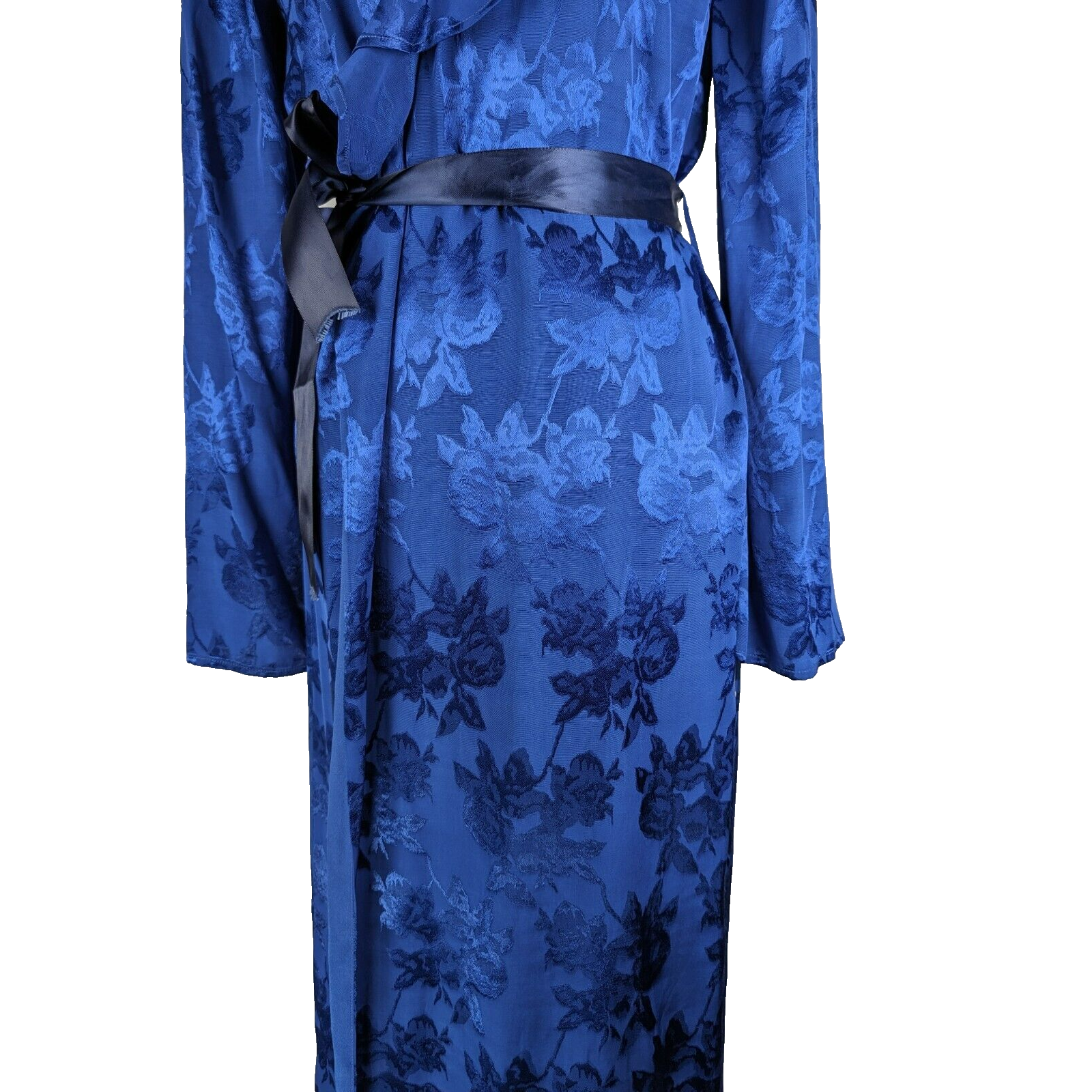 This Bali kimono dress is absolutely stunning! The navy blue floral satin fabric is luxurious, and the ruffled details add such a feminine, elegant touch. It's incredibly versatile—can be worn as a dress, robe, or kimono. Though labeled size S, the wrap style makes it adjustable for more body types. The missing tag and non-original belt don’t take away from its beauty. Perfect for a beach cover-up or a stylish loungewear piece. Love the boho-chic vibes!