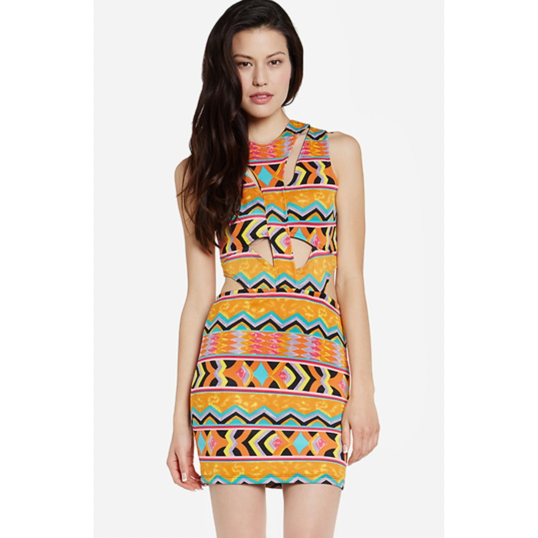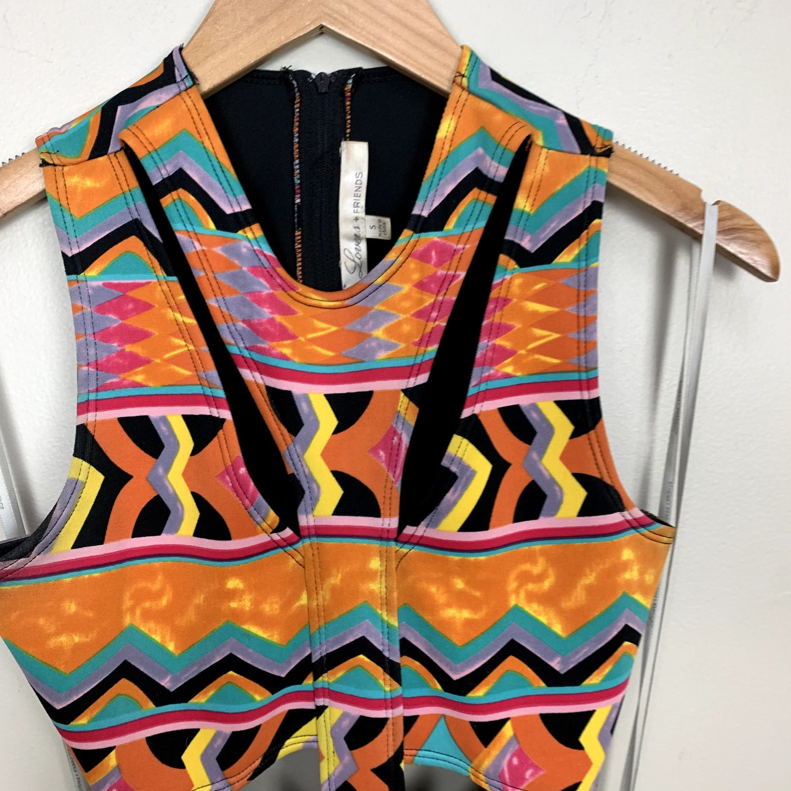 Lovers Friends Got A Body Scuba Neoprene Cutout Mini Dress S Small Bodycon Sleeveless bodycon dress featuring a vibrant striped tribal print and cutouts on bodice, open lower back, full lining, exposed back zipper on bodice and an invisible back zipper on skirt. By Lovers + Friends. EUC, no flaws or notable signs of wear. Size small, measurements in photos.