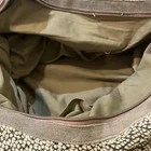 This Lovestitch tote is the perfect accessory for any bohemian-style outfit. The gray and tan color scheme, combined with beaded and embroidered accents, gives it a unique and stylish look. It has double handles and a shoulder strap for easy carrying, and its rectangular shape makes it suitable for travel or everyday use. The bag is made of cotton and leather, while the lining is made of cotton. It has various features such as inner and outer pockets, a mobile phone pocket, and bottom studs. The bag is packable and comes with a zip closure. With its spacious interior and large size, this tote is perfect for any occasion.