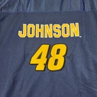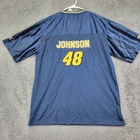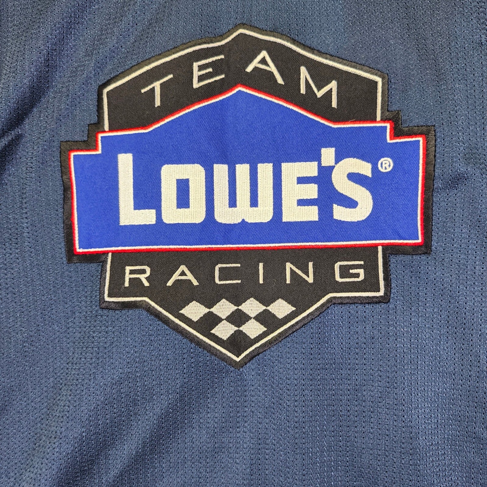 Vintage-inspired NASCAR racing jersey, a vibrant piece showcasing the iconic Lowe's Racing team logo prominently displayed on the front. This eye-catching jersey features a classic V-neck design with contrasting yellow and white stripes, adding a sporty touch. The sleeves are adorned with the NASCAR logo and a smaller graphic, enhancing its authentic racing appeal. The jersey is made from a breathable, lightweight fabric, ensuring comfort and durability. A Chase Authentics tag is still attached, attesting to its authenticity and unworn condition. Color: Blue Department: Men Type: T-Shirt Fit: Regular Sleeve Length: Short Sleeve Character: Race Car Driver, Racing Fan, Team Lowe's, NASCAR Fan Pattern: Graphic Print Character Family: NASCAR, Lowe's Racing Features: Lightweight, Breathable, Contrasting Trim Neckline: V-Neck Material: Polyester Keywords: Chase Authentics, Lowe's Racing, NASCAR, Racing Jersey, Team Shirt, Vintage NASCAR, Collectible, Motorsports, Graphic Tee, Men's Shirt, Race Car, Authentic, Unworn, New with tags all items have been cleaned and disinfected we stand behind all items we sell so please contact us if you have an issue with any order