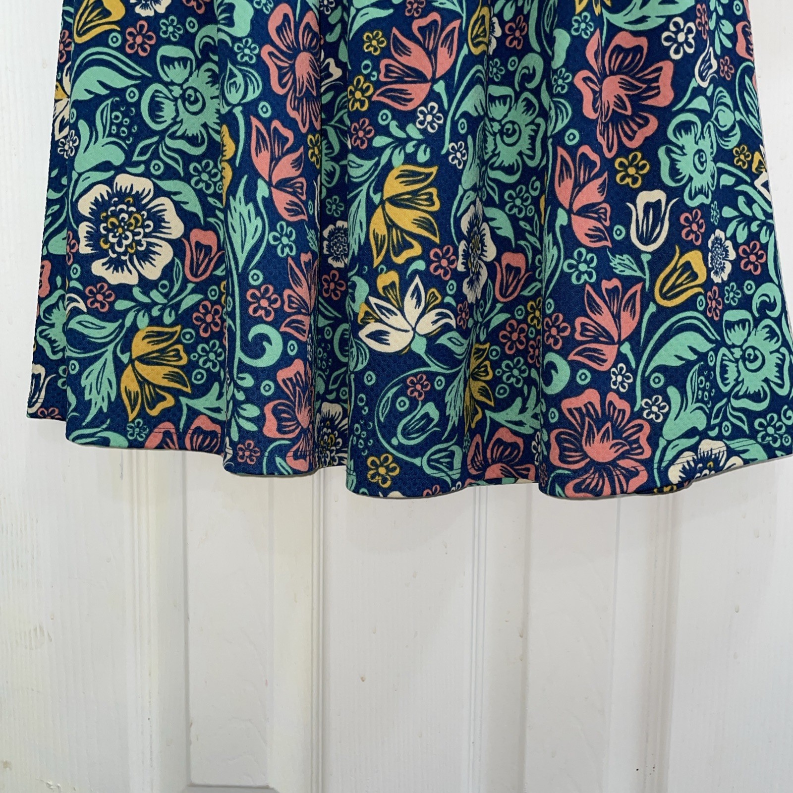 The LuLaRoe Women's Dress Amelia in navy blue, Pink , green, yellow floral pattern is a stylish and versatile fit and flare dress perfect for the spring and summer seasons. Made from a blend of polyester and spandex, this knee-length dress features a round neck, short sleeves, and a charming floral pattern in vibrant shades. With a zipper closure and pockets, this dress combines comfort with a trendy design, making it a standout piece in any woman's wardrobe. Ideal for casual outings or dressed-up events, this LuLaRoe dress is a must-have for any fashion-forward individual.