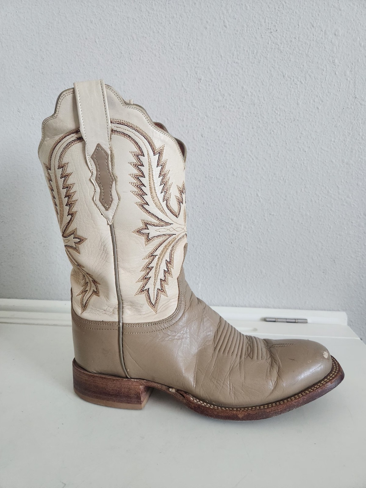 Lucchese 2000 Womens Cowboy Boots T5055KD-Size 8.5 B. Tan and eggshell white. Pre-owned. Has some wear on the toe area but nothing major. Overall in great condition.