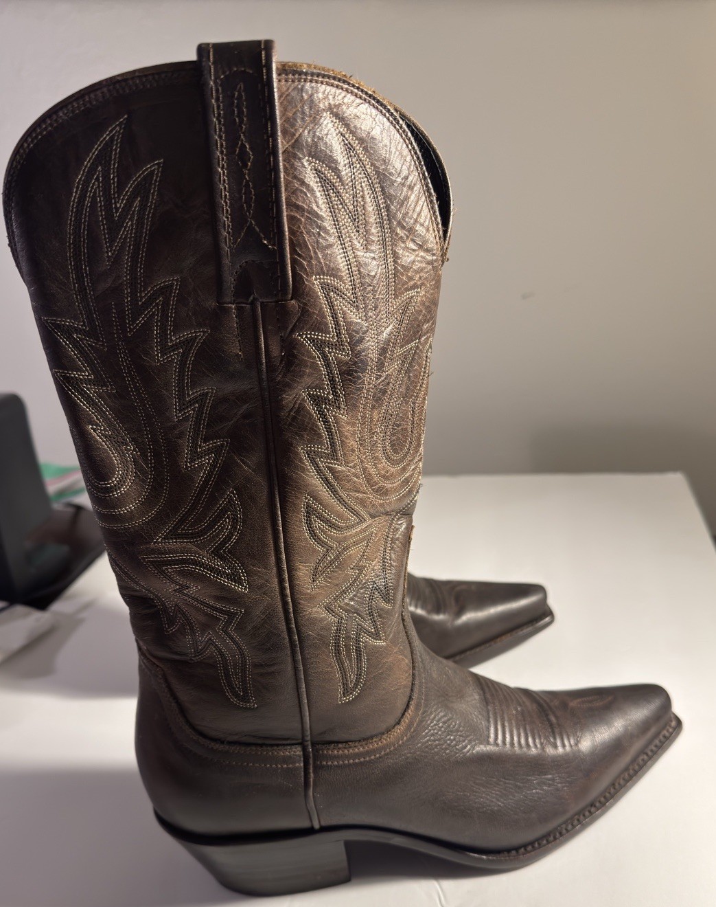 Charlie1Horse Women's Size 7 Western boot - 4509 Brown Leather - EXCELLENT CONDITION - Flat Rate $10 shipping Mad dog Calf Cowboy Charlie 1 Horse by Lucchese 14509 No other boot fits the human foot like a Lucchese boot, thanks to Lucchese's original design, which remains the only one of its kind in boot making today. Each step of the handcrafted process is considered critical to our finished product. When you slip your foot into a Lucchese boot, you'll know why we insist on only the finest. There is no substitute for the experienced hands of a true boot maker. Every pair of Lucchese boots is hand-inspected, not once, but twice. Every inch of a Lucchese boot is made of the finest grade of leathers. In virtually every one of our procedures, we rely on human hands to complete the task to near-perfection. Made of genuine leather upper with classic embroidery 11" shaft with pull straps and piped collar Snip toe profile Cushioned insole and leather lining 1 3/4" western heel