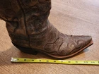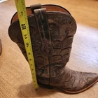 The Lucchese Distressed Mad Dog Goat Leather Women's Brown Heeled Boots M5037 in size 7.5B are a stylish and unique pair of Western-themed boots. Made with high-quality leather, these snip toe boots feature a distressed finish and intricate stitch details. With a comfortable medium calf width, these boots are perfect for adding a touch of personality to any outfit. Ideal for women who want to make a statement with their footwear, these Lucchese boots are a fashionable and quality choice for any wardrobe. Smoke-free home.