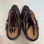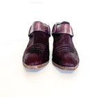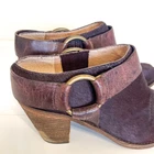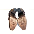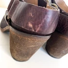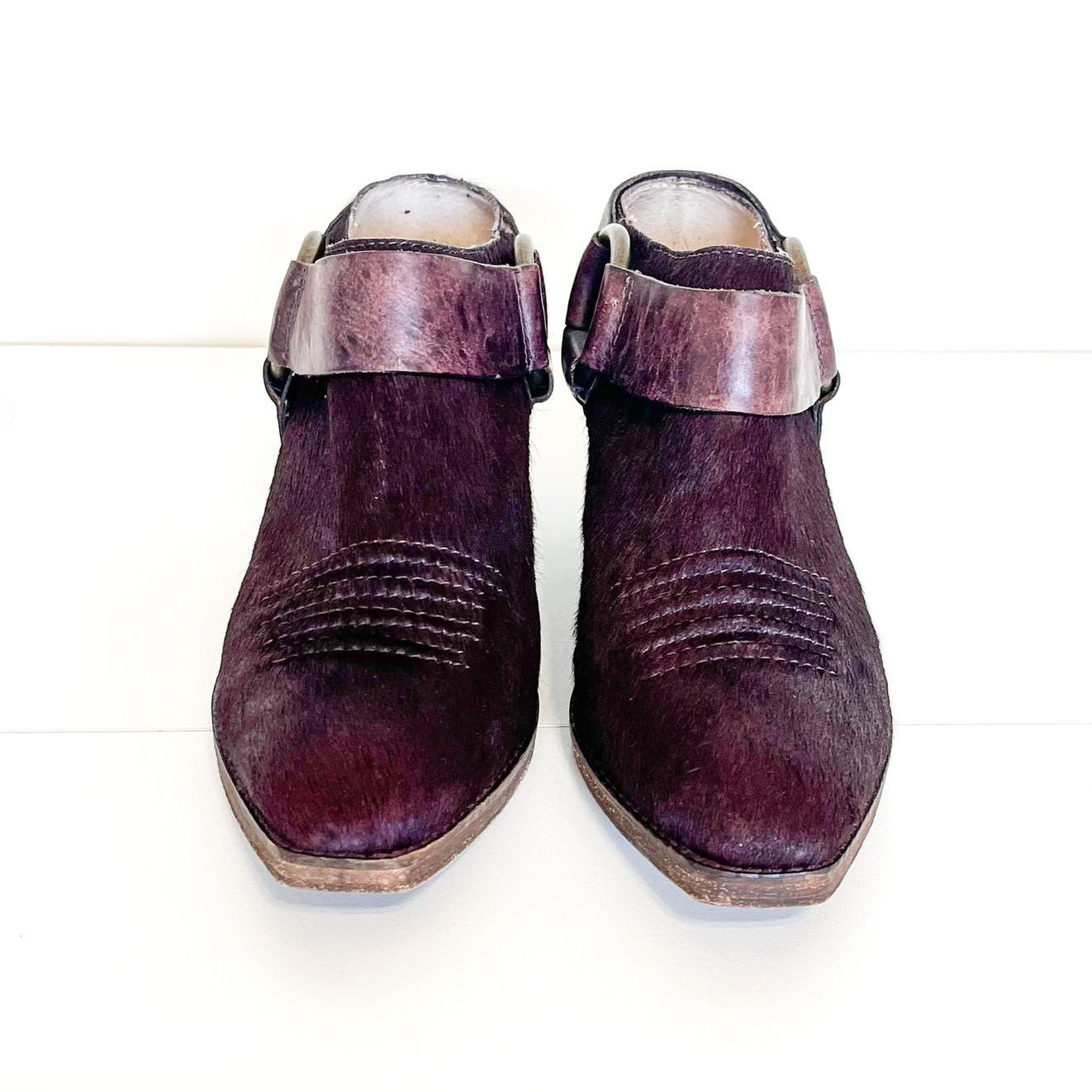 Pony Hair Stacked Chunky Heel Lucchese Spirit Kylie Women's Cowgirl Bohemian Festival Booties Mules Clogs Shoes Leather upper lining and sole Leather and metal harness strap accent Slip on Stacked chunky block heel Square toe Oxblood burgundy maroon red port color Sz 9M Heel 3.25 Great condition with light wear from normal use see last 2 pics