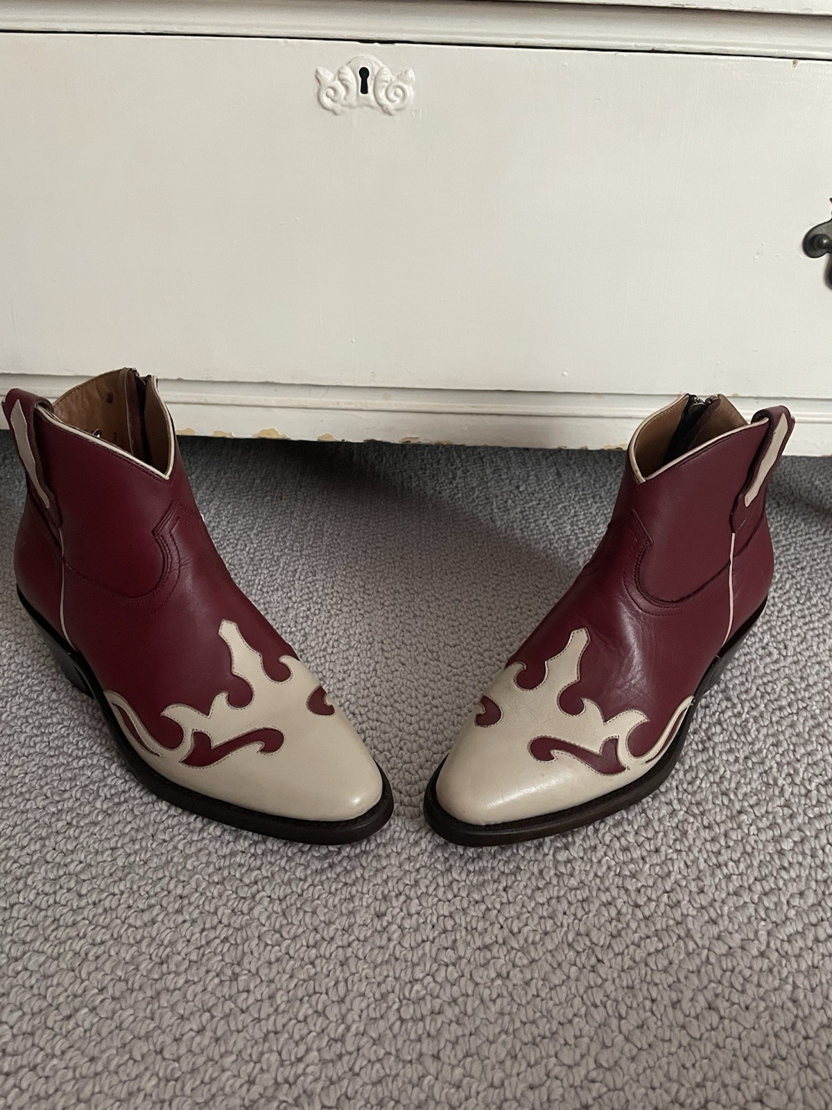 Brand new, never worn size 8.5 lucchese boots- handmade by artisan bookmakers. You can’t find quality & comfort like these just anywhere! Stylish red leather wingtip with a low heel. Dress up or dress down your outfit with these fun accent!