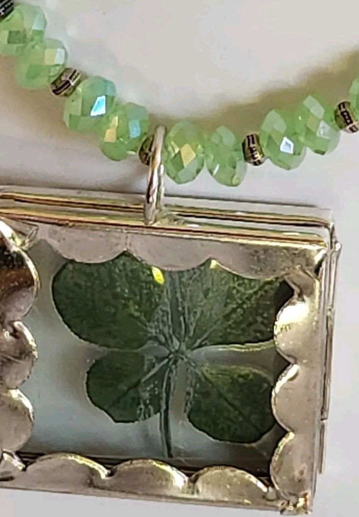 REAL 5 LEAF CLOVER /LUCKY/ST PATRICKS DAY Clovers are found in the Pacific North West grew naturally in the wild. Since the four leaf clover is naturally grown it is rare in shape Clover is laminated and painted green maintain color LIGHT green faceted beads 4 LEAF CLOVERS REPRESENT FAITH HOPE LOVE LUCK