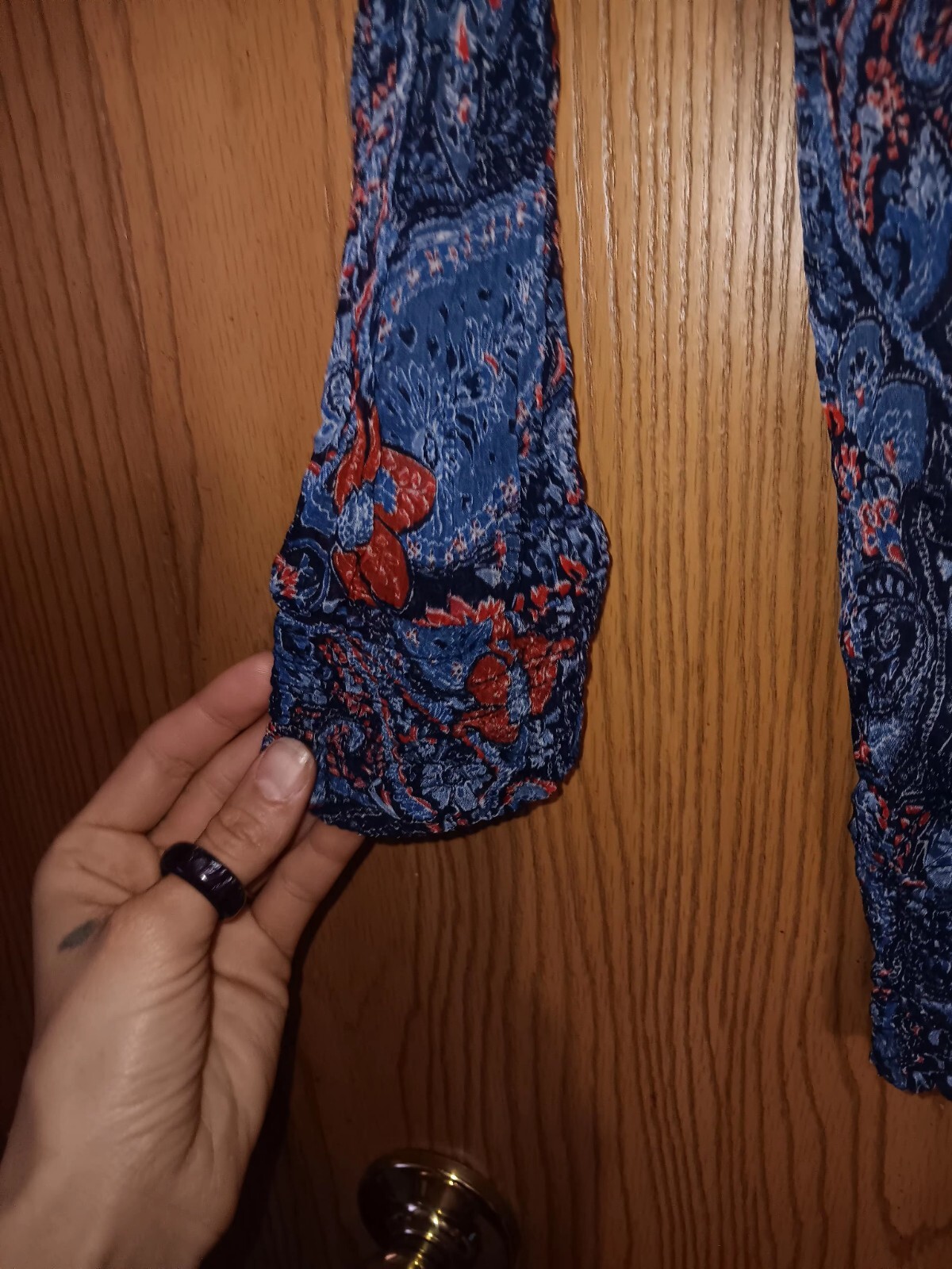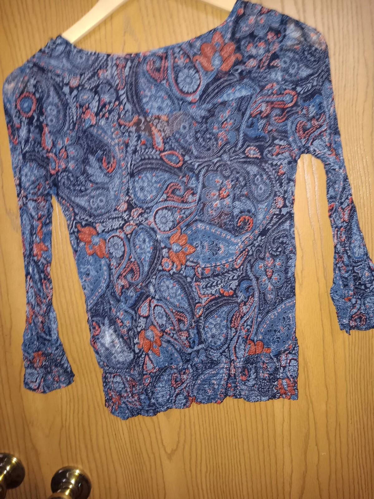 This is a Lucky Brand blouse for women in size XS, featuring a mid-sleeve design with a paisley pattern in blue. The blouse is part of the "Live In Love" theme, adding a touch of romance to the piece. Perfect for casual or semi-formal occasions, this top combines comfort and style with its regular fit. The intricate paisley design adds a bohemian flair to the overall look, making it a versatile addition to any wardrobe.