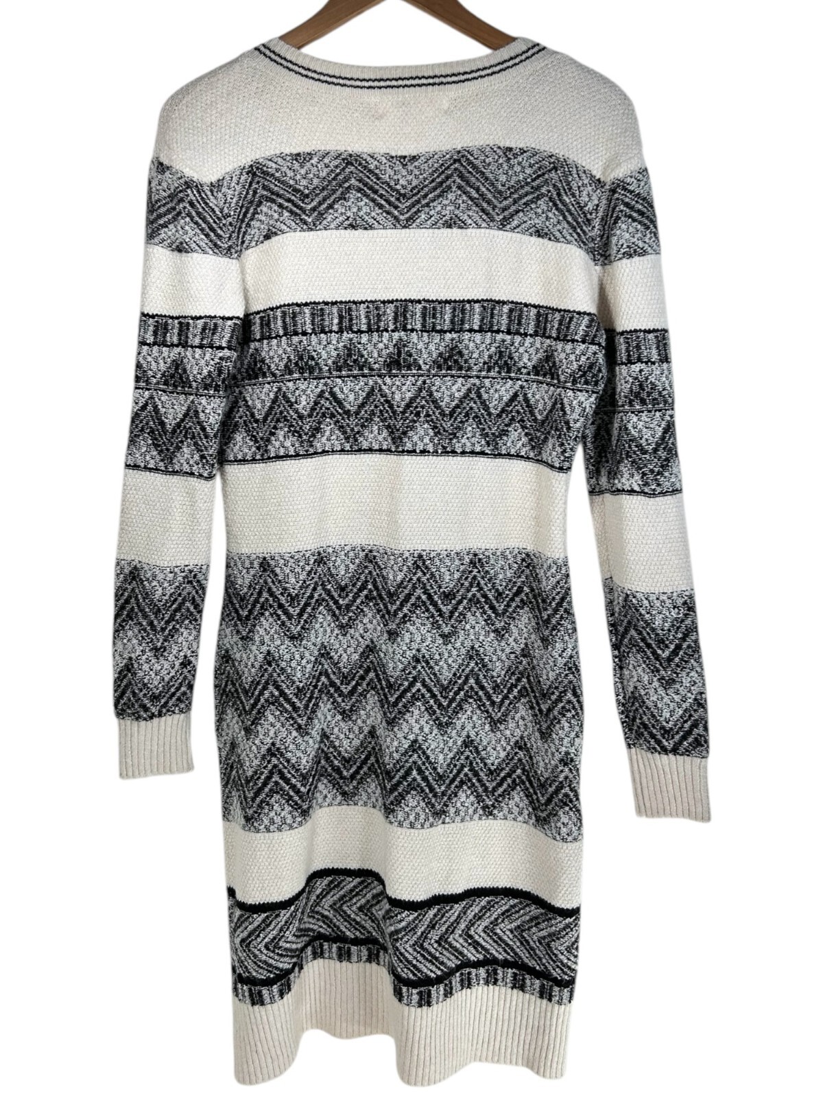 NWT Lucky Brand Midi Sweater Dress in Ivory white/black combo Womens medium Midi length cardigan sweater dress style Colorblock geo print stripes VNeck with button down closure, extra button included 3/4 quarter length sleeves with fitted ends Super soft and stretchy Knitted fabrication with plenty of stretchy Made with polyester Knit/made in China Full length: 41.5” Pit to pit: 18.5” across #luckybrand #luckybranddress #mididress #colorblockdress #buttondowndress #luckybrandmididress #geoprint