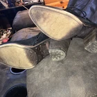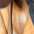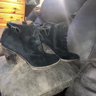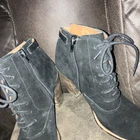 These Lucky Brand EchoH ankle booties are a stylish choice for women in size 8.5 with an almond toe shap style. Featuring a chunky high heel and lace-up closure, these black suede booties have a vintage-inspired design with a suede fabric type and leather lining and insole. The booties have a retro Y2K, rock, hippie, punk, grunge vibe, making them a versatile and trendy addition to any wardrobe. Vintage, a little wear on the bottoms & heels BUT THEY LOOK GREAT ON!! Very flattering Sexy Stylish I feel like a brown & black sharpie should take care of the scuff on the heel