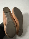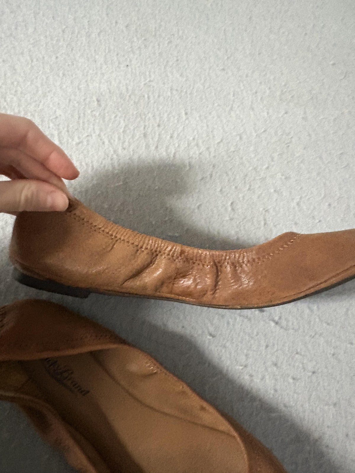 Brand: Lucky Brand Style: Womens round-toe ballet flats with elasticized topline and stitched heel detail. Color: Tan / light cognac brown. Size on shoe: US 6.5M. Materials: Soft leather-like upper with man-made lining and rubber sole (material tag not fully visible, exact composition not confirmed). Details: Slip-on design, lightly cushioned insole for comfort, flexible rubber outsole with Lucky Brand logo.