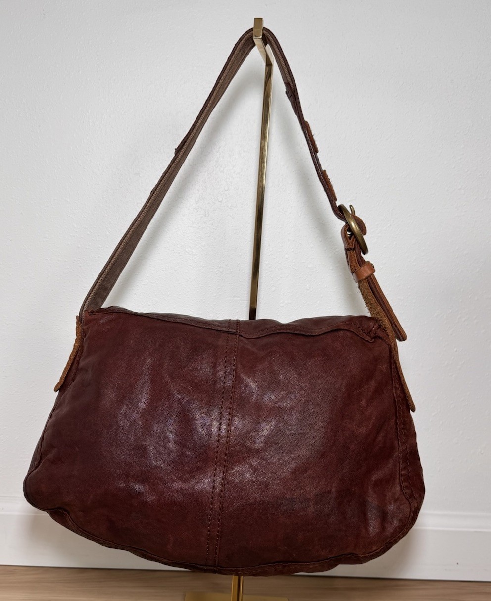 Great overall condition! Very soft, the shoulder strap is beautiful! Has a few pen marks on the interior lining, see pictures for details. The Lucky Brand Fold Over Lamb Shoulder Bag in dark brown genuine leather with brass hardware.