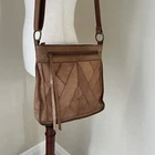 This Lucky Brand Rayla Crossbody Bag is a must-have for anyone who loves the bohemian style. The bag is made of high-quality brown leather and features a patchwork design that adds a unique touch to your outfit. It has a zip closure and an adjustable crossbody strap that allows you to carry it comfortably on your hip. The bag has a rectangular shape and measures 10.5 inches in height, 10 inches in width, and 3 inches in depth. It has brown tassels and a zipper for added security. The interior is lined with brown fabric and has inner pockets for easy organization. This bag is perfect for travel and casual occasions. Get your hands on this Lucky Brand Rayla Crossbody Bag today!