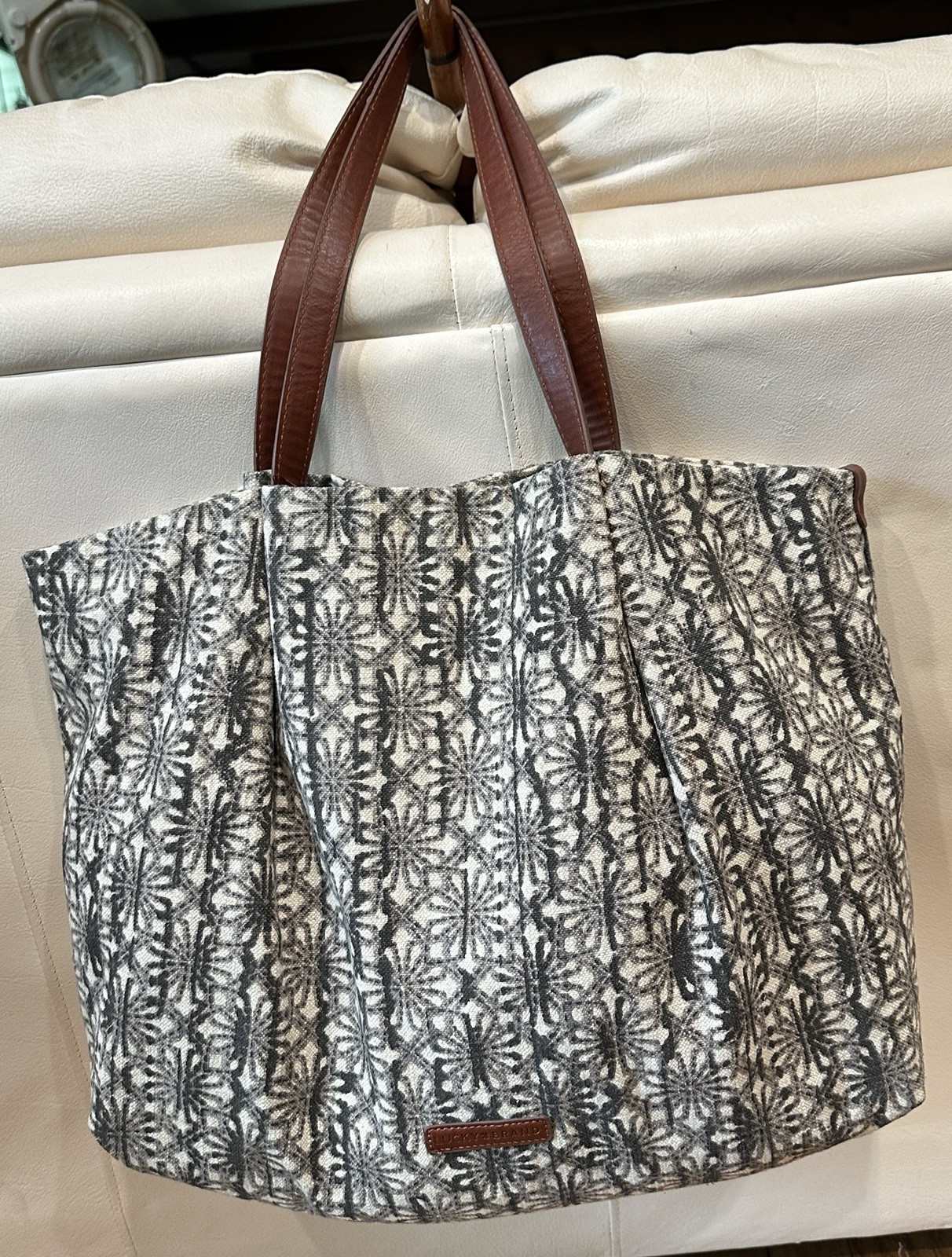 Fab Lucky Brand Designer TAKE A TRIP Portland Casual Tote Satchel Shoulder Bag Retail$98 Features: Unique, edgy, heavy canvas made of cotton/linen blend fabric slightly rounded top of bag Dark , forest green/brown and gray design on beige background stylish wrap of fabric/ tucked, around handles , adding reinforcement properties magnetic snap close faux leather handles and trim -looks and feels like real leather inside zipper pocket two large patch pockets inside easily packable to fit on the bottom of a suitcase - makes a great carryon! Measurements approx. 19" W x 15" H x 5" D Handles drop 10.5 " Unused, New condition-No bag charm included. Items will always be mailed within one business day of purchase, and by using the most reliable and cost efficient method. If there is a huge difference in price, you will receive a shipping credit. I want to foster great lines of communication with my buyers. Please check out all photos, and feel free to ask questions before purchase. Thanks for looking, and check out my other fab handbags for sale.