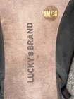 Elevate your wardrobe with these stylish Lucky Brand Women’s Black Suede Slingback Stiletto Pumps. These pumps feature an open toe design with a buckle closure and ankle strap accent. The high stiletto heel measures between 3-3.9 inches, making it perfect for any formal occasion such as weddings, parties, or business events. The suede upper material is accented with a logo and the lining and insole are made of soft leather for added comfort. These pumps are available in UK Shoe Size 6, US Shoe Size 8, and EU Shoe Size 38. The synthetic outsole material provides durability and stability. Add these stunning heels to your collection and step out in style today! Preowned Good Condition