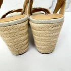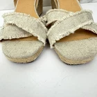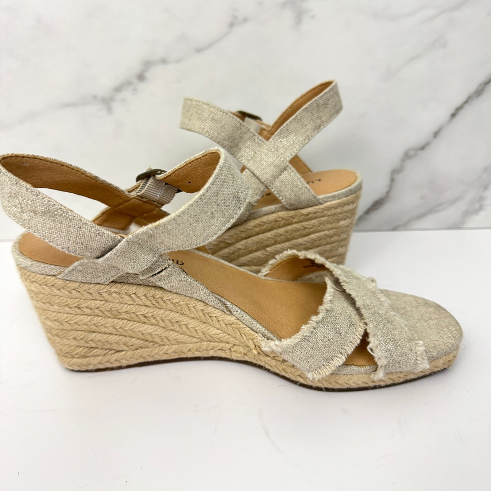 Brand: Lucky Brand Size: 8 1/2 M, EU 39 Condition: In very good pre-loved condition with normal wear. All my shoes are cleaned to give them the freshest look for you. Color: Cream tan with a metallic hint Material: Textile upper Approximate Measurements: 3 in heel height Features: Rounded open toe Adjustable buckle closure Stretch gussets Classic espadrille style Intentional frayed detail on straps Tags: spring, summer, travel, resort wear, cabana, beach, pool, resort, cruise, warm weather, casual, vacation, summervibes, beachvibes, coastal, nautical, casual Fridays, neutral, classic