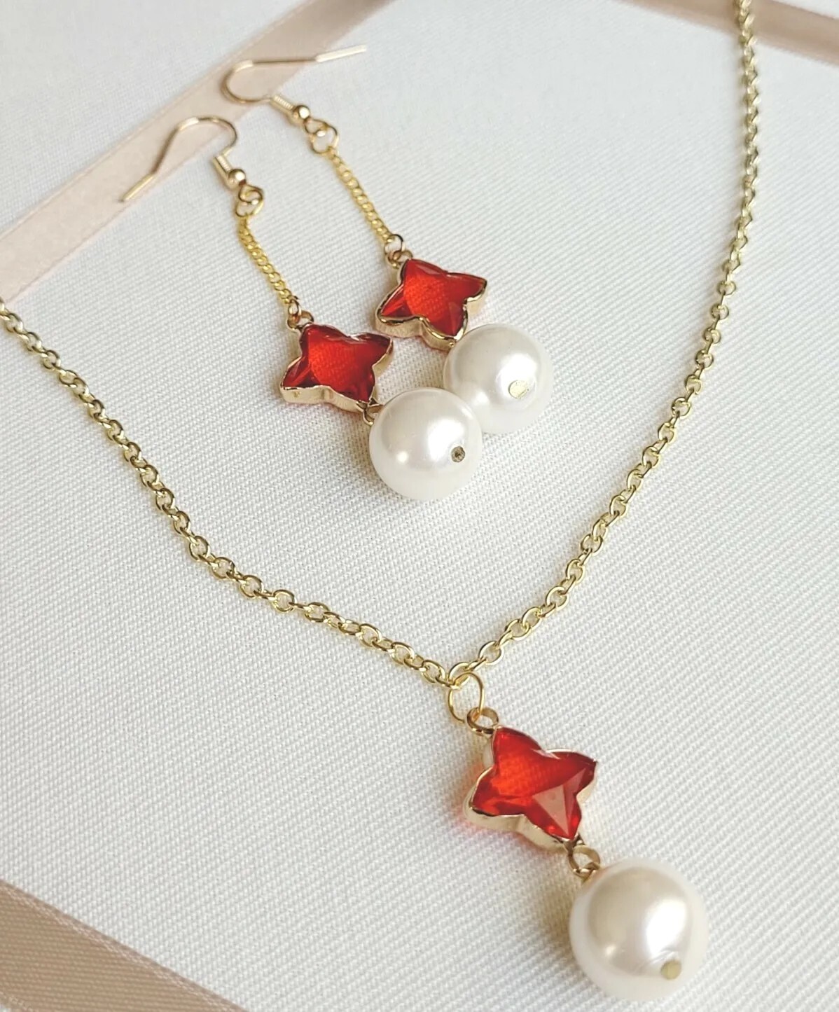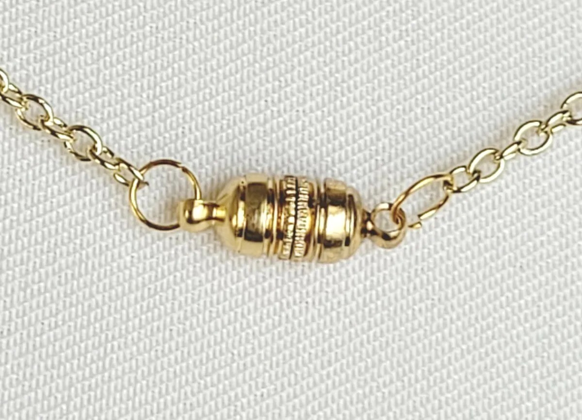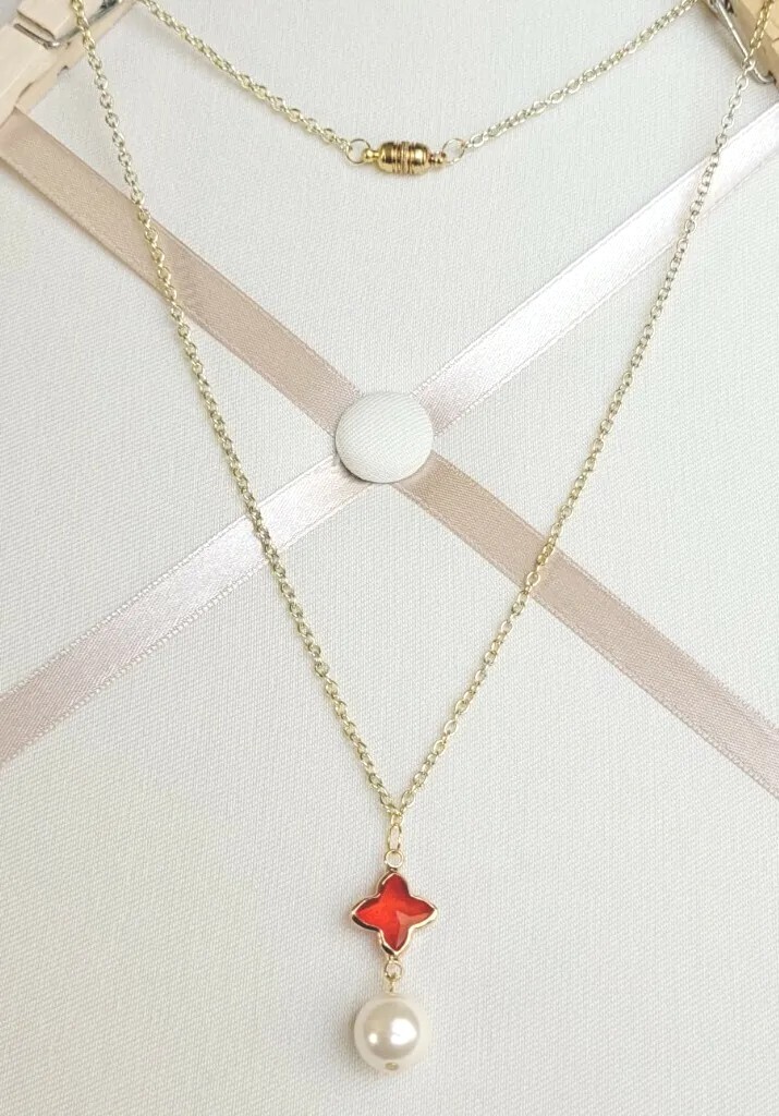 This elegant AR necklace features a clear clover-shaped pendant with a red main stone and a glass pearl accent. The pendant hangs from a 20-inch yellow gold filled chain with a magnetic closure. This charming piece is perfect for any occasion. The lucky clover design exudes a lovely, feminine, and stylish vibe. Ship free with USPS ground advantage.