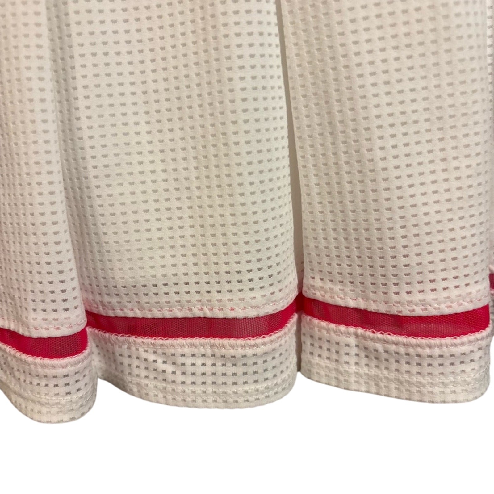 Chic white tennis skirt. Ideal for active wear. NWOT Overview Overview Every point will look stylish in the Lucky in Love Women's Micro Tuck Pleat Skirt. This sporty white skirt has an elastic waist with built-in shortie, a contrast mesh magenta pink stripe insert on the hem and pleats that are stitched down along the hips for a flattering fit. The soft, breathable perforated fabric wicks away moisture to keep you cool and dry on the court. Content: 88% Tactel, 8% Lycra, 4% Nylon Built-in shortie Moisture wicking Colors: White / Black White / Coral Crush Model is 5'6" and 120 lbs. She is wearing size Small. Fit Details Fit: True to size Rise: Natural Waist (or "At Waist") Skirt Length: 14" (size S) Each size changes by .25" Inseam Length: 3.5" Overall Fit: Semi-Fitted Academia, Varsity, Sports, Sporty , Tennis, Tennis Skirt, Athletic, Casual, Comfy, Stretchy