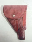 The "Luger Holster Viking Basket Weave" is a high-quality cowboy/western holster designed specifically for a Luger P.08 pistol in 9mm Luger caliber. Made from leather with a unique basket weave design, this holster is both functional and stylish. It is suitable for those who appreciate traditional Western-style holsters and desire a secure and reliable carrying option for their Luger pistol. The Viking brand ensures durability and craftsmanship in this holster tailored for the iconic Luger firearm.
