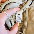 Beige/Tan color Logo in front Puffer style Outside zipper pocket on back Side release buckle on adjustable belt Lots of space with multiple netting pockets inside Gently worn in good condition