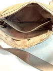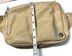 The Lululemon Everywhere Belt Bag in Khaki Beige is a stylish and functional crossbody waist bag purse perfect for travel, casual outings, or workwear. This small rectangular bag features a zip and buckle closure, adjustable strap, and inner pockets for organization. Made with durable nylon material in a solid tan beige color, this belt bag showcases the signature Lululemon logo and is part of the brand's Om Bag product line. The versatile design and practical features make it a must-have accessory for women on the go.