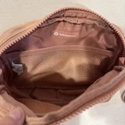 The Lululemon Everywhere Belt Sling Bag in Pink LU9AX2S is a medium-sized backpack designed for women. It has a rectangular shape with a buckle and zip closure. The handle and strap are made of pink nylon, and the hardware is silver. The bag is lightweight and has inner pockets. It is suitable for travel, casual, and workwear occasions. The Lululemon Om Bag product line is featured, and the bag is adorned with a zipper accent. The crossbody strap is adjustable, and an additional unbranded strap is included. There is a small jack mark on the back of the bag. See photo.