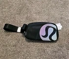 Add some color to your workout routine with this Lululemon Belt Bag. The black exterior is accented with a vibrant rainbow logo, making it the perfect accessory for any active woman. The bag is designed to fit all your essentials and features a comfortable belt for easy wear. Ideal for any outdoor activity, this belt bag is a must-have for any fitness enthusiast.