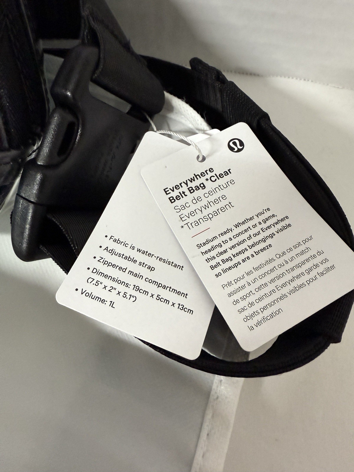 Brand New Received as a gift, but I probably won't use this Lululemon Everywhere Belt Bag 1L Clear The zipper has a very smooth open and close feeling The belt is adjustable. Fully extended it measures 41.7 inches per their website The belt has the embossed words Lululemon and the logo on the plastic is very nice Use as a fanny pack or a chest/shoulder bag Unisex, men or women Clear, see through bags are required for many sports stadiums now Get ready for Fall sports! The blue tissue is just so you can see the bag better Retails for $38 plus shipping Check out my other great items I have for sale :0)