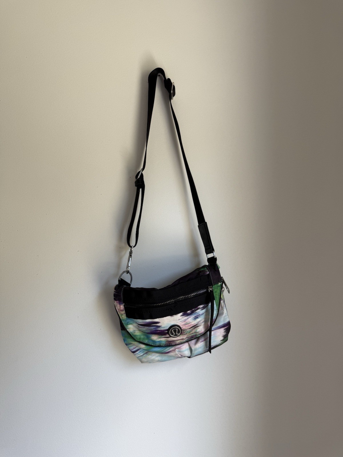 Unique and stylish Lululemon crossbody bag featuring a vibrant multicolor abstract print with shades of purple, green, and blue. Designed with a secure zipper closure, adjustable strap, and the iconic Lululemon logo on the front. ✔️ Spacious enough for everyday essentials — wallet, phone, keys, and more ✔️ Adjustable strap for comfortable crossbody or shoulder wear ✔️ Lightweight and practical, perfect for casual outings, gym, or travel ✔️ Iconic Lululemon logo for an authentic sporty-chic look ✔️ On one of the photos, you can see a very small stitch imperfection — barely noticeable and does not affect durability or use ✔️ The lining is overall almost untouched, with only minor signs of wear Condition: Pre-owned, good overall condition, clean exterior, with lining in excellent shape and minimal wear.