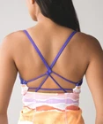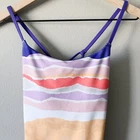 Lululemon Athletica Dancing Warrior Tank in Bleacher Stripe White Iris Flower/Iris Flower. Size 2 (see size dot). Luon fabric. Adjustable strappy back. Moisture wicking and breathable. Stretchy. Pockets for cups, but cups are not included. Retailed for $58. Pre-owned, excellent used condition.