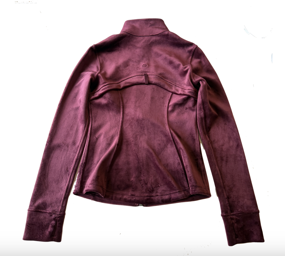 Stay cozy and stylish in this pre-owned * Lululemon Define Jacket Velvet in the beautiful Garnet color (size 6). Made from a soft cotton-blend velour fabric, this jacket features a sleek, fitted silhouette with thumbholes and zippered pockets. Details: Style: Define Jacket *Velvet Color: Garnet Size: 6 Soft velour fabric with stretch Full zip front, thumbholes, zippered pockets Gently pre-owned – shows light wear typical of velour (see photos), no holes or major flaws Returns not accepted – please review photos and sizing before purchase.