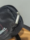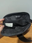 Upgrade your style with this limited edition Lululemon Everywhere Belt Bag in black. Perfect for travel and casual occasions, this small-sized bag has a rectangle shape and a zip closure. The black nylon exterior material and crossbody strap handle offer a sleek and timeless look, while the silver and black hardware adds a touch of sophistication. The bag features a lined interior with inner pockets and dividers, making it easy to organize your belongings. The detachable strap and additional accessories, such as the pouch and audio pocket, provide convenience and functionality. With its unique Lululemon Om Bag product line and rare logo pattern, this belt bag is a must-have for any fashion-forward woman.