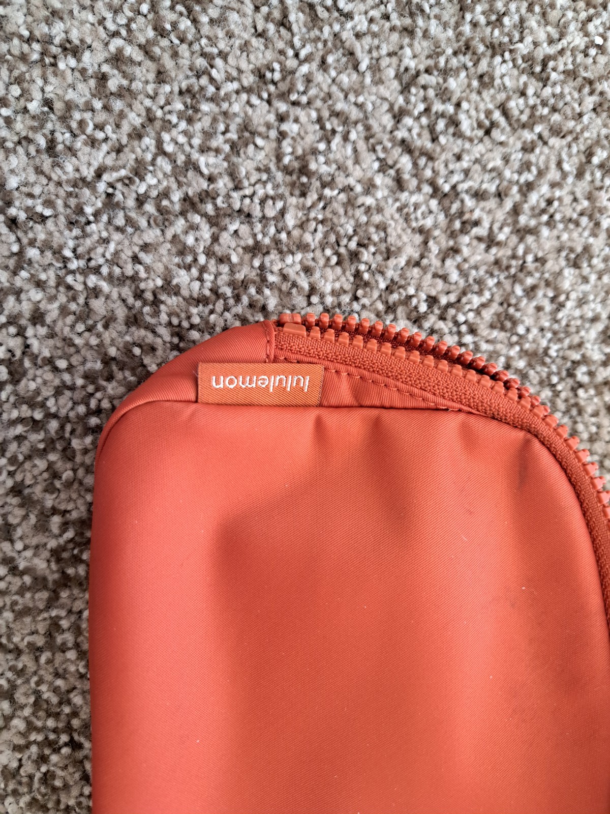 The Lululemon Everywhere Belt Bag is a small rectangular bag with a zip closure and a black crossbody strap. Made of fleece fabric with a matte finish, this belt bag is designed for everyday use with a classic solid pattern. The exterior is in a burnt orange color with silver hardware accents, while the interior features a nylon strap, adjustable strap drop, and multiple pockets for organization. Perfect for hands-free convenience and on-the-go style, this Lululemon Everywhere Belt Bag is a versatile accessory for women on the move.
