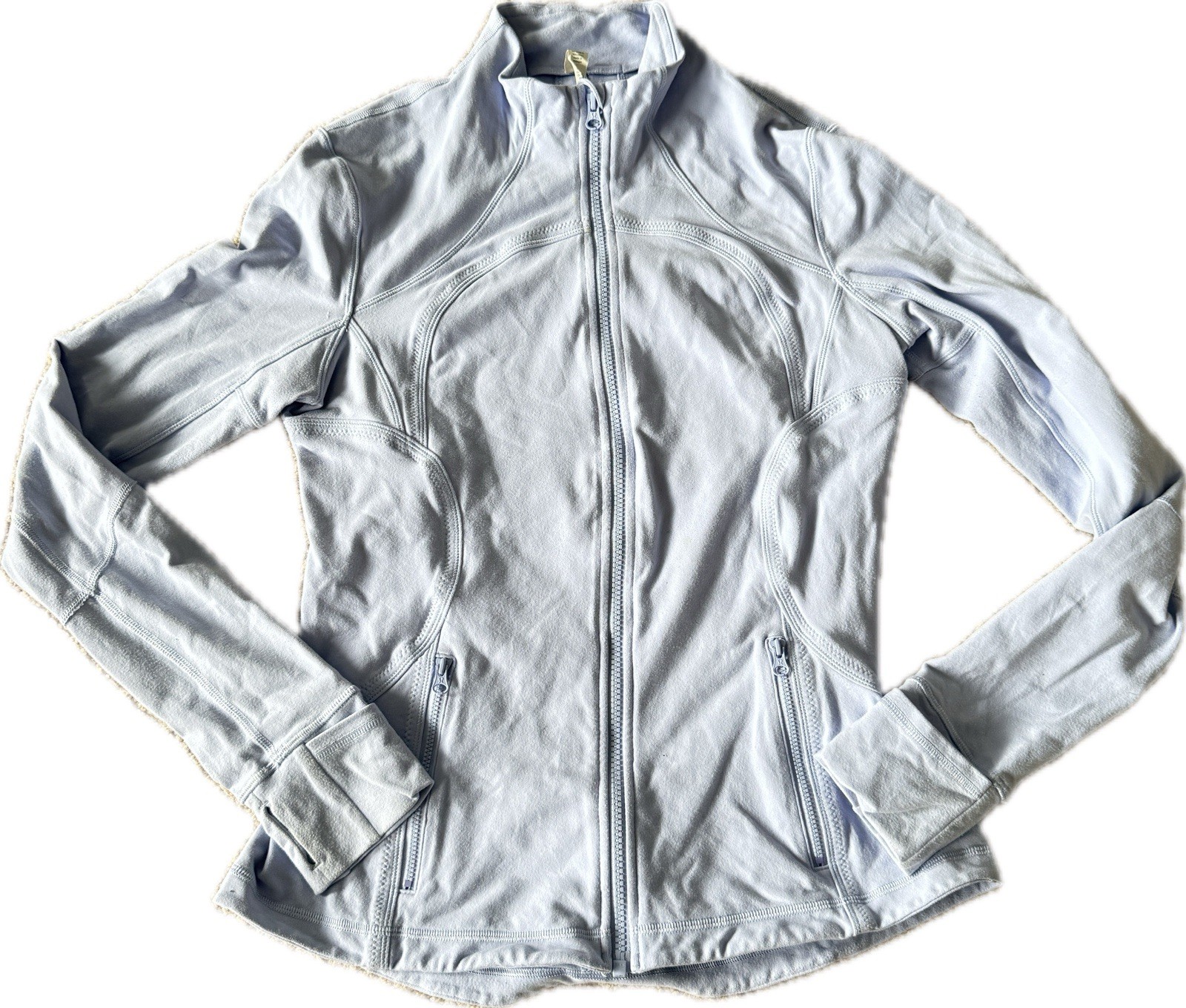 Lululemon Forme Jacket Cool Breeze (light purple/blue) Size 10 Style #W4B27S *Has some stains on front and cuffs as shown in photos. I have not tried to remove the stains yet. Why we made this When we're heading to class, we want a cozy mid-layer that can stand on its own. We designed this stretchy luon fabric jacket with zipper pockets to hold our gear for us while we grab a tea with friends before we head in to the studio. Key features secure zipper pockets for your phone, keys and cash thumbholes keep your sleeves in place and make layering easy moisture-wicking fabric helps pull sweat away from post-practice skin park that zip in the zipper garage before it scratches your chin mesh venting in the armpits helps you let off steam dropped hem for more coverage in the rear Tech specs designed for: yoga, run fabric(s): luon® properties: four-way stretch, moisture-wicking, preshrunk, chafe-resistant, breathable fit: fitted length: mid-hip