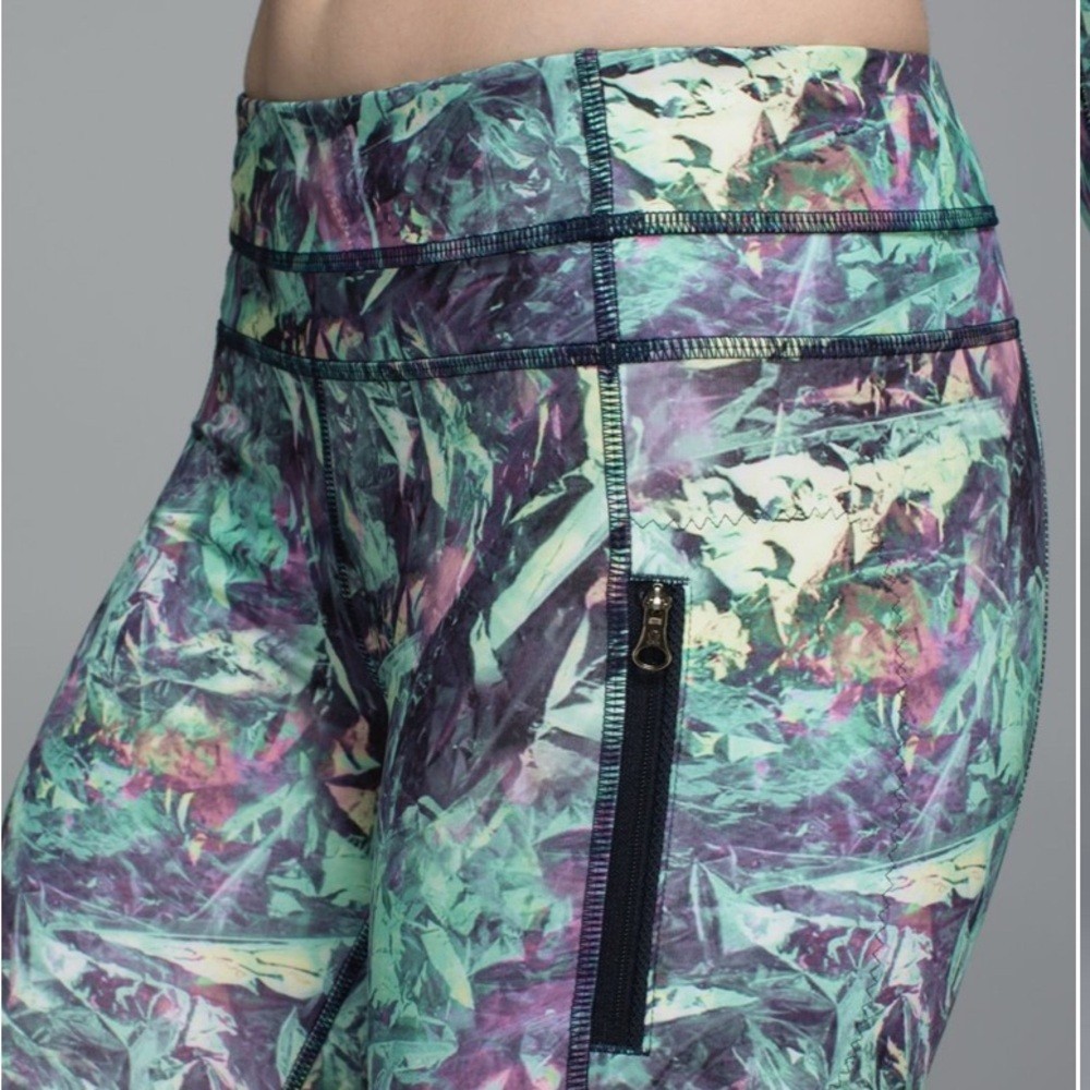 Explore comfort and style with these multicolor patterned leggings. Key features Full-On Luxtreme® fabric is sweat-wicking and four-way stretch with added LYCRA® fibre to hug your curves breathable Mesh details help add ventilation two secure zipper pockets on the legs to stash your valuables waistband pouches for gels, lip balm and anything else you can't run without. Approximate measurements on a flat surface. Length: 34” Rise: 8.5” Waist: 13.5” Inseam: 26” B11-725-7
