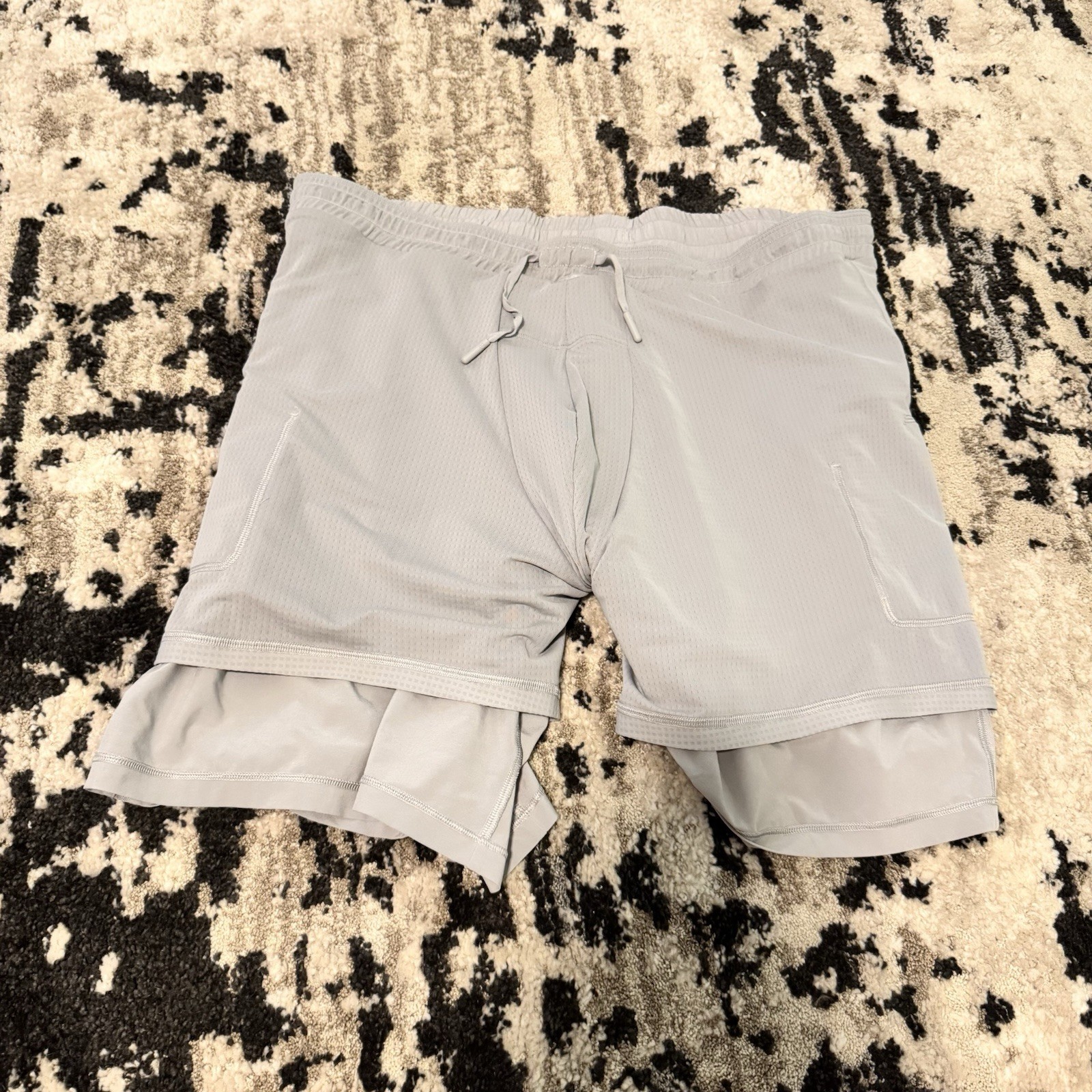 GUC. Men’s size XXL. Swift fabric. 18” waist. • Style: Pace Breaker shorts, lined and 7" inseam. The short are a light gray or "Silver Drop" color. • Features: They have deep side pockets and a secure, zippered pocket on the side for essentials like keys or a phone. $78 retail still on Lululemon website. *minor marks on front near pocket and back near logo*