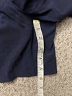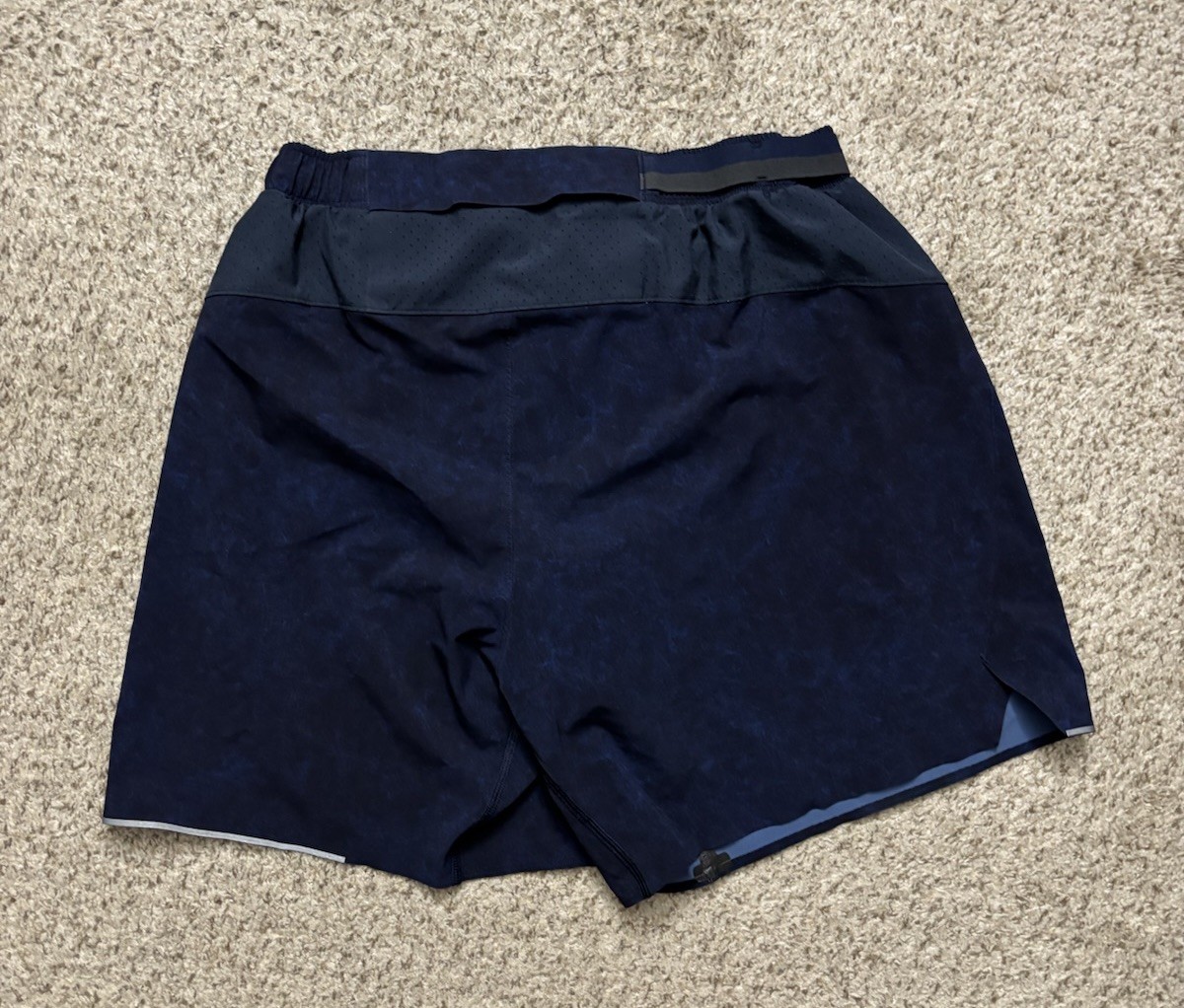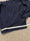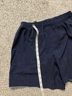 No dot/tag size. Waist stretches comfortably to 32", possibly a Medium. The Lululemon Men's Medium Navy Blue Surge Shorts are designed for active occasions, specifically for running and gym training. These 6" shorts feature a solid pattern with a drawstring closure for a secure fit. Made from a polyester-spandex blend, they offer a comfortable and elastic waist with moisture-wicking properties, making them perfect for outdoor sports during the summer and spring seasons. With a reflective design and lined interior, these athletic shorts by Lululemon provide both style and functionality for the modern man on the go.